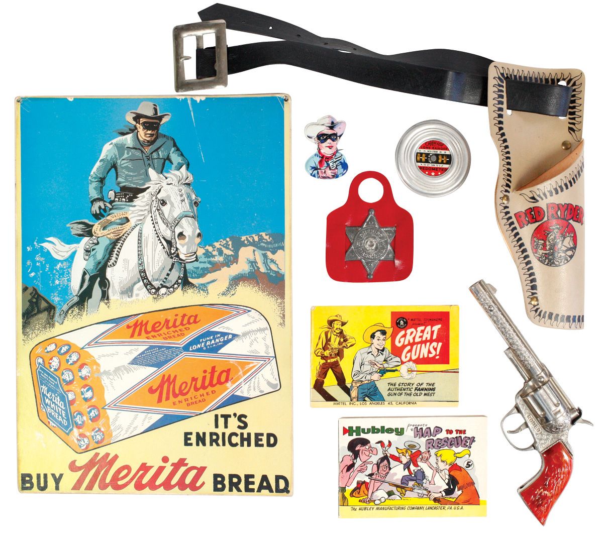 Western toys, etc. (11), Lone Ranger Merita Bread cdbd advertisement; board game; diecut litho pin back; pedometer; Red Ryder & Lone Ranger books, Fred Harmon plastic single holster pistol set w/Hubley Rodeo orange grips, Hubley & Mattel comic books that came w/pistols, US Sheriff's Marshal badge on orig hanger, etc., all VG cond, up to 10"H x 19.5"W.