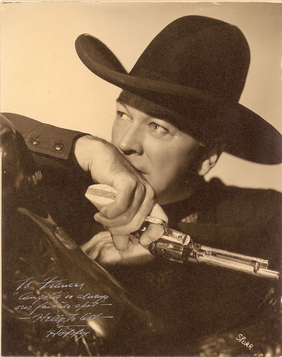 Classic vintage textured matte-finish 11 x 14 Melbourne Spurr photo of Boyd clad in dark cowboy garb and nonchalantly wielding a revolver, signed and inscribed in white ink, “To Frances, ‘Angelo’s is always our favorite spot’—Hello to all—Hoppy.” In fine condition, with slightly trimmed edges.