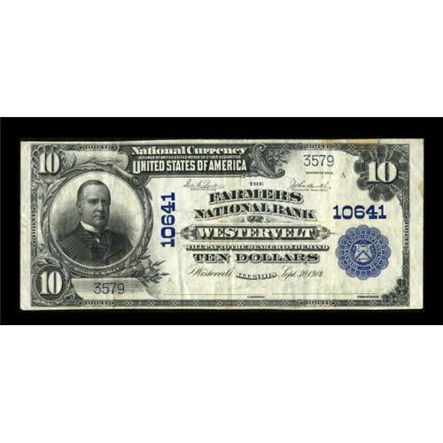<B>Westervelt, IL</B></I> - $10 1902 Plain Back Fr. 631 <B>The Farmers NB</B></I> Ch. # 10641<BR> This is the only bank chartered in this small community, and is just plain rare. The Kelly census shows just four large notes recorded, and our records show only three large size appearances of any kind from here at public sale since 1945. <B>Very Fine.</B></I> <BR><BR><BR><b>Shipping:</b> Coins & Currency (<a target="_blank" href="http://www.heritageauctions.com/common/shipping.php">view shipping information</a>)