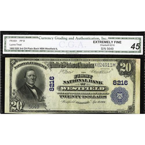 <B>Westfield, IL</B></I> - $20 1902 Plain Back Fr. 651 <B>The First NB</B></I> Ch. # 8216<BR>This $20 is mostly bright with some light staining and the signatures are missing. <B>CGA Extremely Fine 45.</B></I>