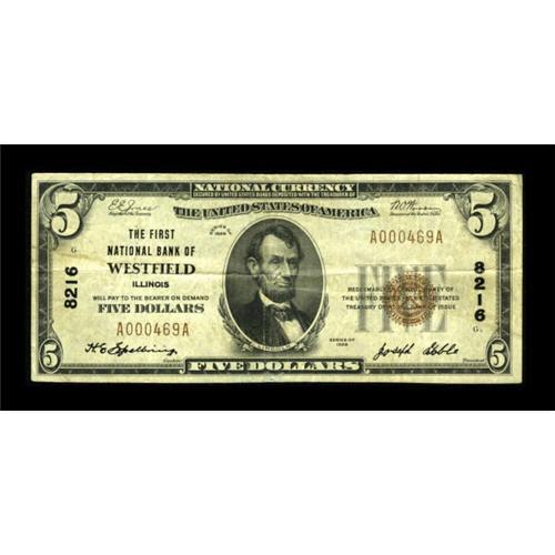 <B>Westfield, IL</B></I> - $5 1929 Ty. 1 <B>The First NB</B></I> Ch. # 8216<BR> This bank shows a huge disparity in the census between large notes and small, with 31 large examples reported against just three small. This is one of that trio, and the nicest by a considerable margin. <B>Fine-Very Fine.</B></I><BR><BR><b>Shipping:</b> Coins & Currency (<a target="_blank" href="http://www.heritageauctions.com/common/shipping.php">view shipping information</a>)