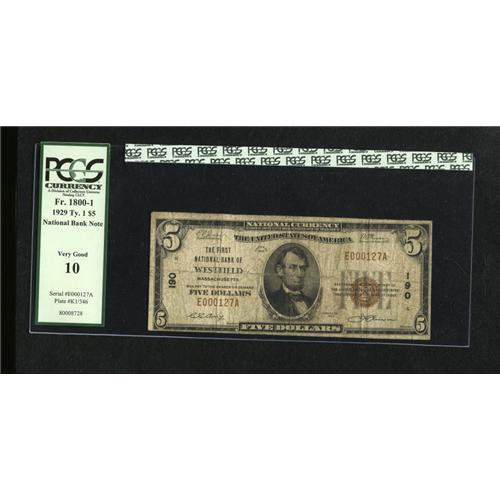 <B>Westfield, MA</B></I> - $5 1929 Ty. 1 <B>The First NB</B></I> Ch. # 190<BR>Officers are C.E. Avery and J.A. Kenyon. <B>PCGS Very Good 10.</B></I><BR><BR><b>Shipping:</b> Coin/Currency (<a target="_blank" href="http://www.heritageauctions.com/common/shipping.php">view shipping information</a>)