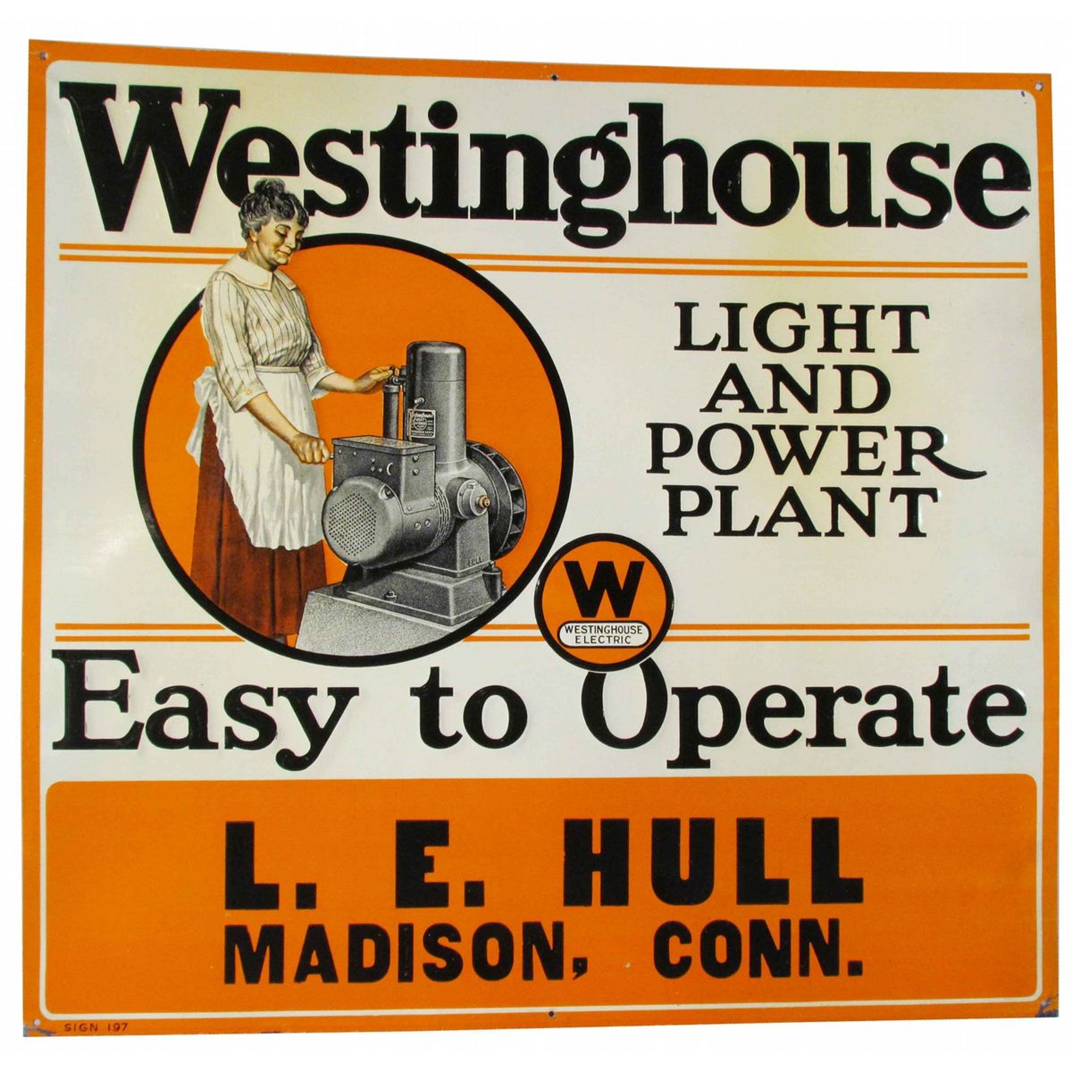 Westinghouse Light & Power Plant Embossed Tin Sign. L.E. Madison, Conn. Near mint condition. 24 X 22 1/2 inches.