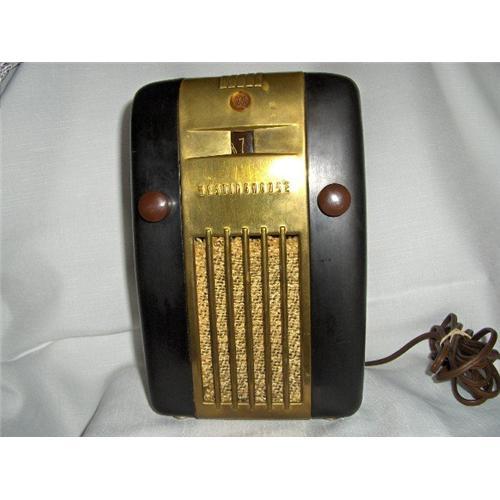 Westinghouse Refrigerator Portable AM Radio, Model H-126. This "Little Jewel" radio is made of a brown bakelite body with brass down the center, front and back. It has a "hidden" handle, which contours down the back. The handle is brass and plastic. There are two knobs on the front, one for on/off/volume, the other is the station dial knob. The stats are, 105/125 Volts,50/60 Cycles,AC or DC, 35 Watts, six tubes. There is a gold "W" on the front top that lights up when turned on. Radio works great. The brass has it's original patina. The bakelite has a few faint surface scratches, if buffed, these would disappear. No splits, cracks, chips. There is a small indentation on the top. Overall this is a great piece. See photos. Take a look at my other items. Thank you for viewing.