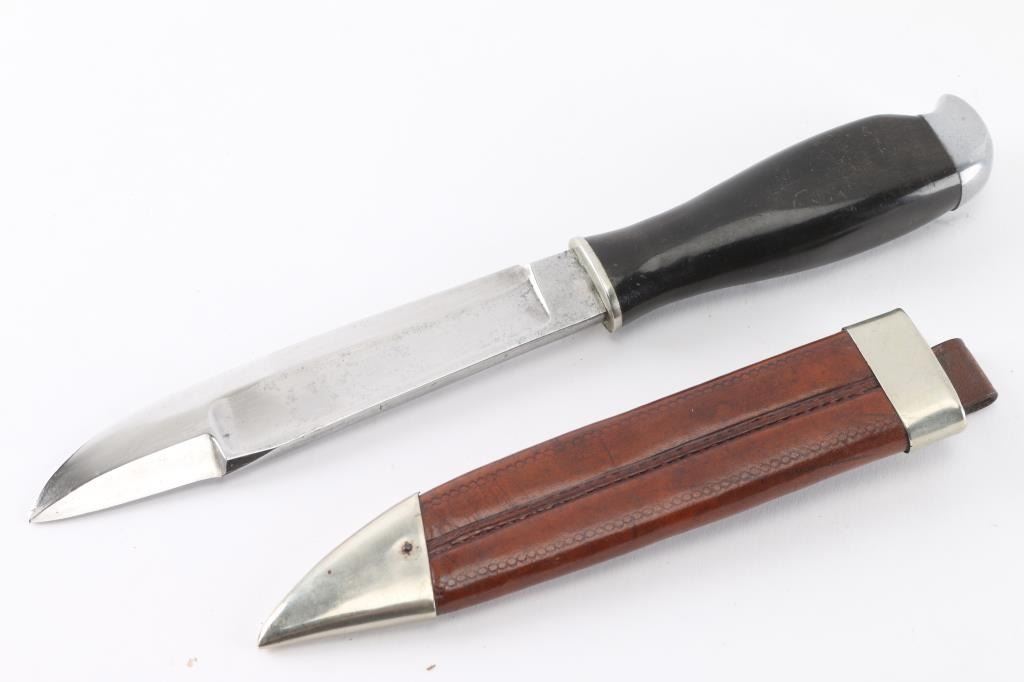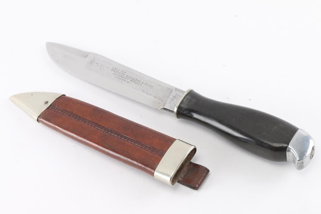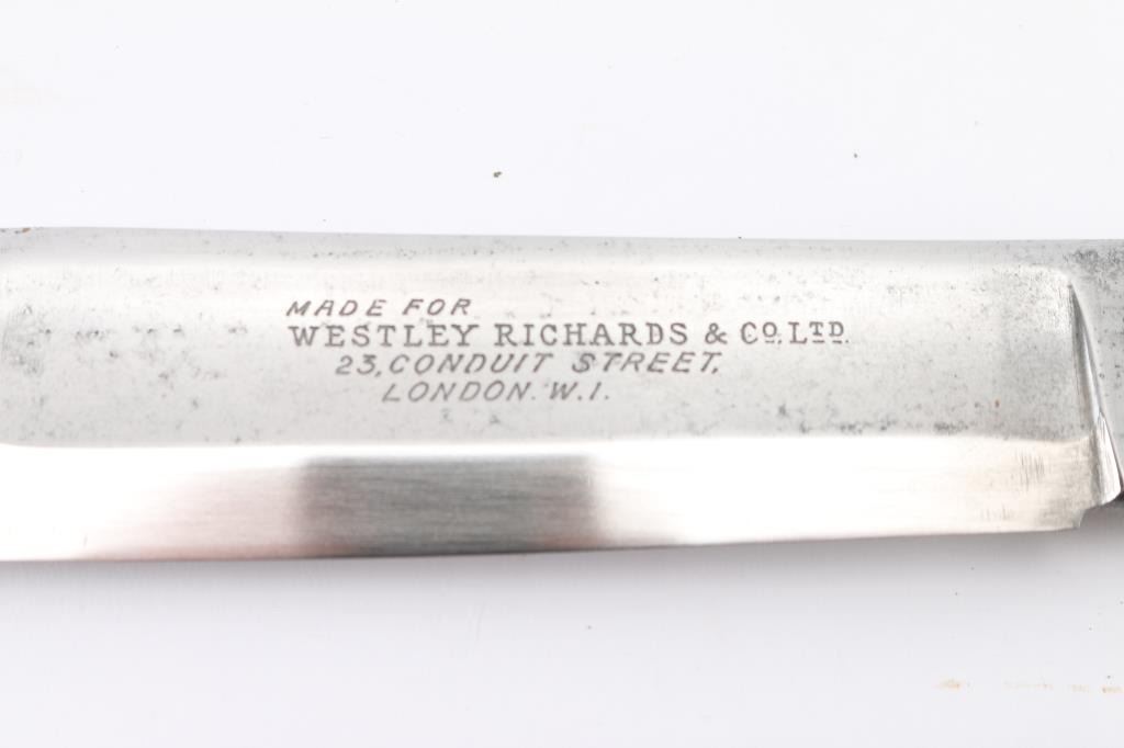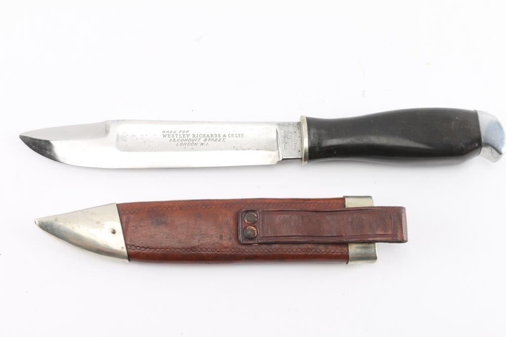 Classic pre 1900 English hunting knife, marked made for Westley Richards & Co, London w. marked by maker Johnson, western works, Sheffield (no England). 12" overall w/ thick stock, 7" reinforced piercing blade and horn grip. Original scabbard. Minor edge sharpening. Very good plus condition overall. African exploration era.