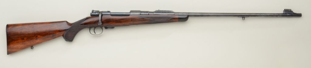 Westley Richards bolt-action rifle, .318 Accelerated Express caliber, 26” round barrel, re-blued finish, checkered wood stock, five leaf rear sight, hooded front sight, sling swivel eyelets, #lT42059. Thisgun is in overall very good + condition showing the majority of a quality old re-finish, very good to fine bore, crisp action, very good markings, very good wood stock; accompanied with approx. 30 brasscasings in old cardboard box marked “318 Express”; a high quality rifle. Est.: $800-$1,600.