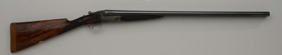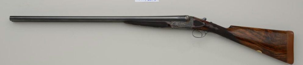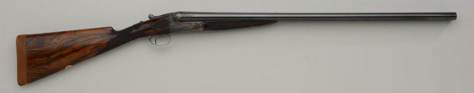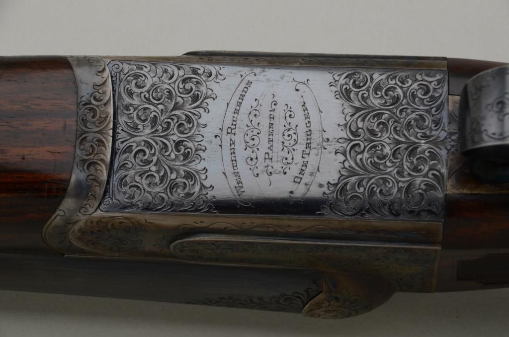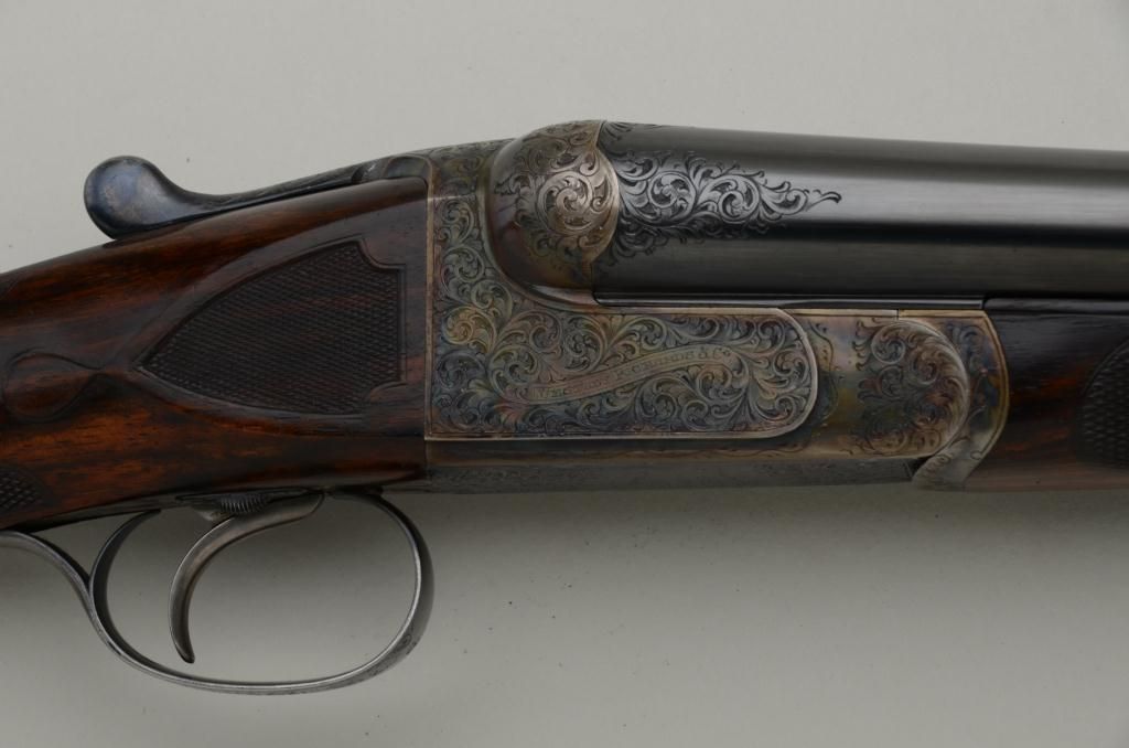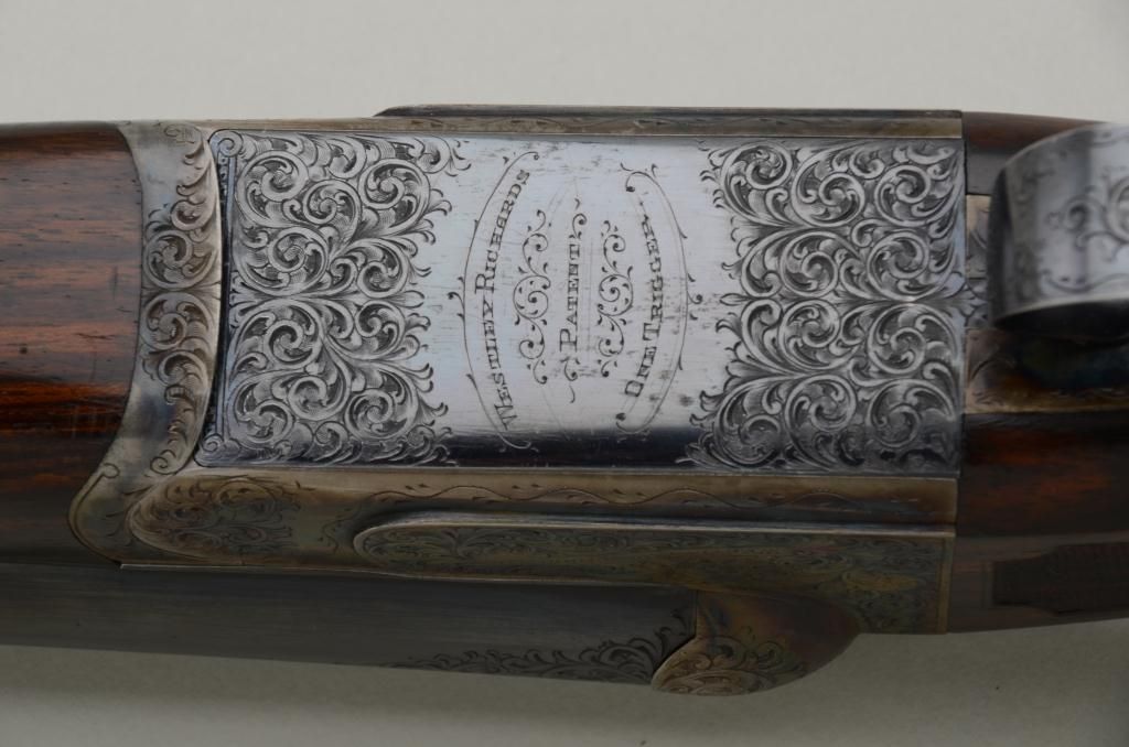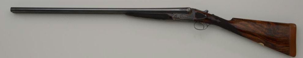 Westley Richards double barrel deluxe best quality drop-lock side-by-side shotgun in 12 gauge with factory single trigger and auto ejectors. In its original case with trade label serial number T 7221. The gun remainsin fine to near excellent original condition with 28 inch barrels, 2 3/4 inch chambers and proofed for full 2 3/4 inch modern loads. The right barrel measures .37 for full choke and left barrel measures .48 for extra full. The wall thickness measures .31 right and .36 left barrel. The barrels retain 97% - 99% original bright blue with just some minimal beginning normal age and the frame shows 95% to 98% original case hardening also agingjust very slightly. The stocks are nicely checkered with side panels and stocks have been very lightly refreshed. The trigger guard shows 50% bright original blue and the frame is nicely engraved with the breach endof the barrels engraved to match. Bores are bright and near excellent. This fine gun has seen just a little use and no abuse. The stock measures 14 ¼ inches to the end of a hard leather English type pad. The stock
