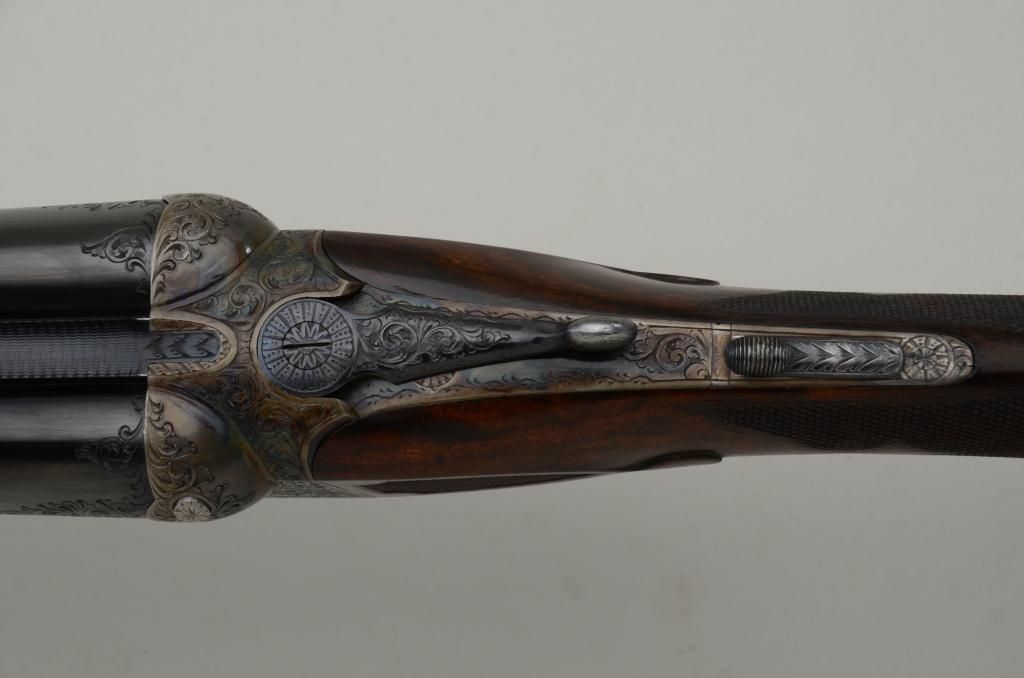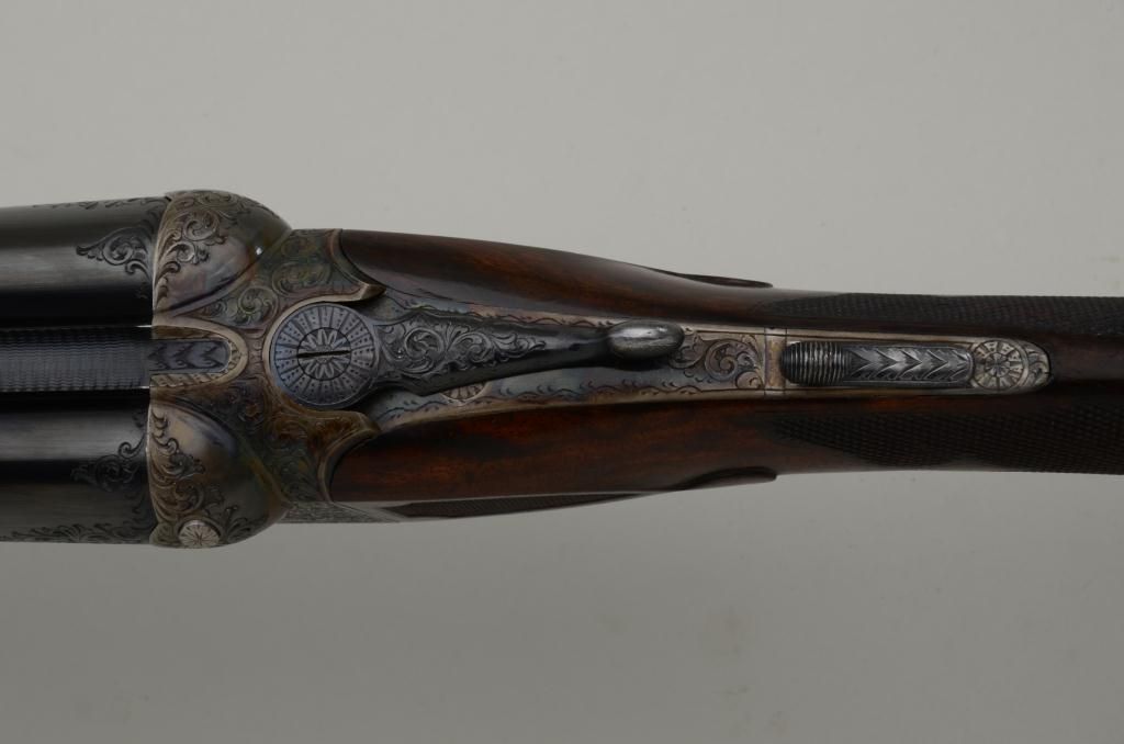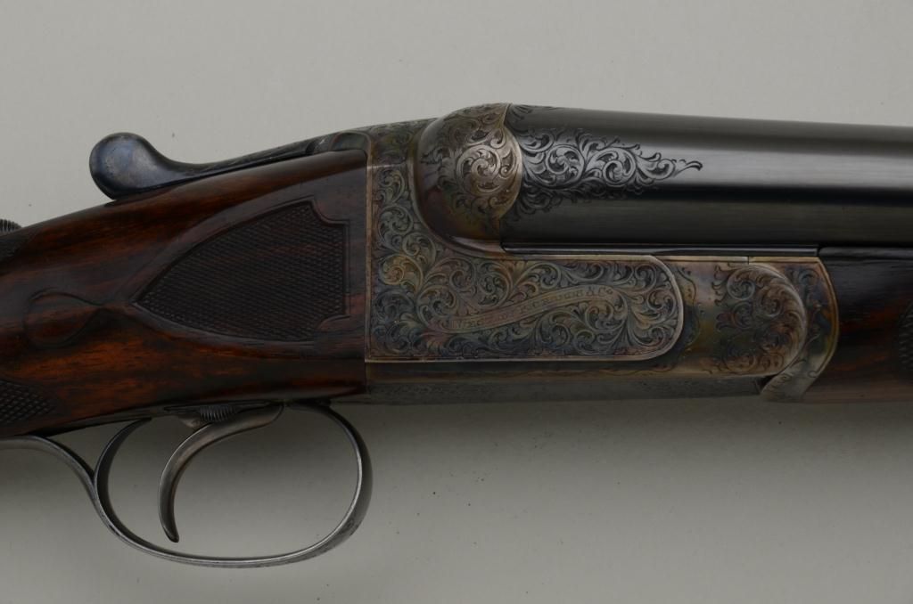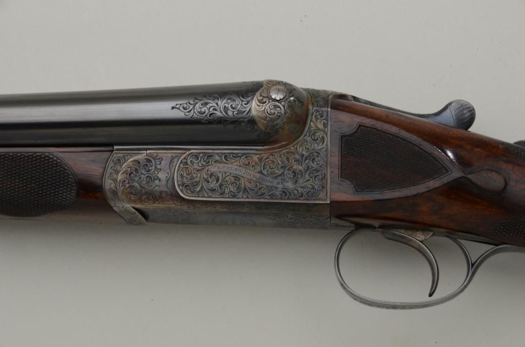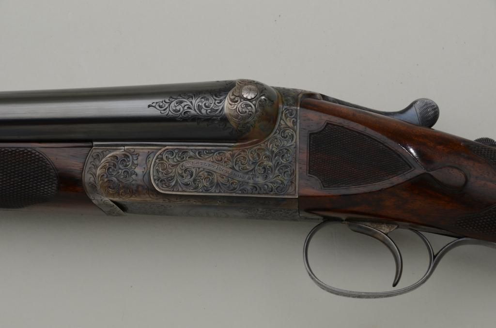Westley Richards double barrel deluxe best quality drop-lock side-by-side shotgun in 12 gauge with factory single trigger and auto ejectors. In its original case with trade label serial number T 7221. The gun remainsin fine to near excellent original condition with 28 inch barrels, 2 3/4 inch chambers and proofed for full 2 3/4 inch modern loads. The right barrel measures .37 for full choke and left barrel measures .48 for extra full. The wall thickness measures .31 right and .36 left barrel. The barrels retain 97% - 99% original bright blue with just some minimal beginning normal age and the frame shows 95% to 98% original case hardening also agingjust very slightly. The stocks are nicely checkered with side panels and stocks have been very lightly refreshed. The trigger guard shows 50% bright original blue and the frame is nicely engraved with the breach endof the barrels engraved to match. Bores are bright and near excellent. This fine gun has seen just a little use and no abuse. The stock measures 14 ¼ inches to the end of a hard leather English type pad. The stock