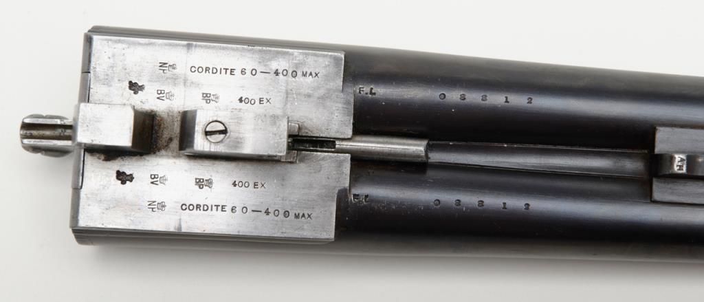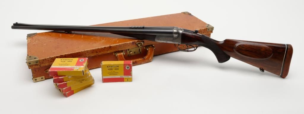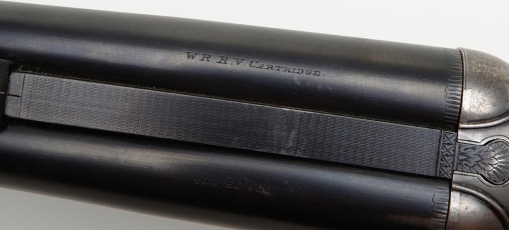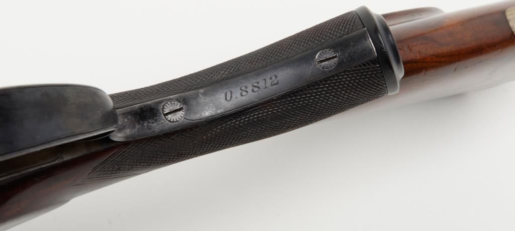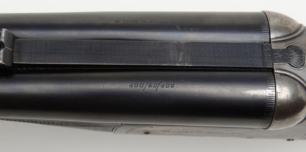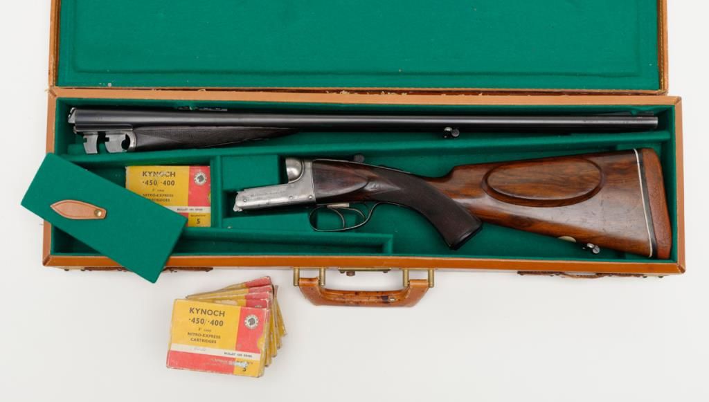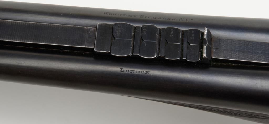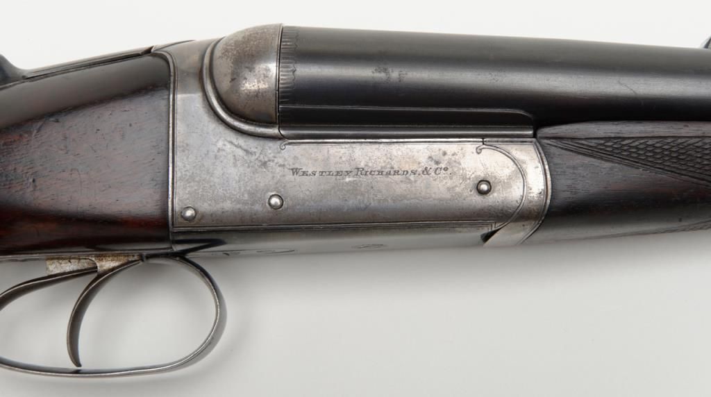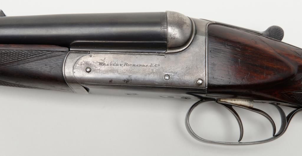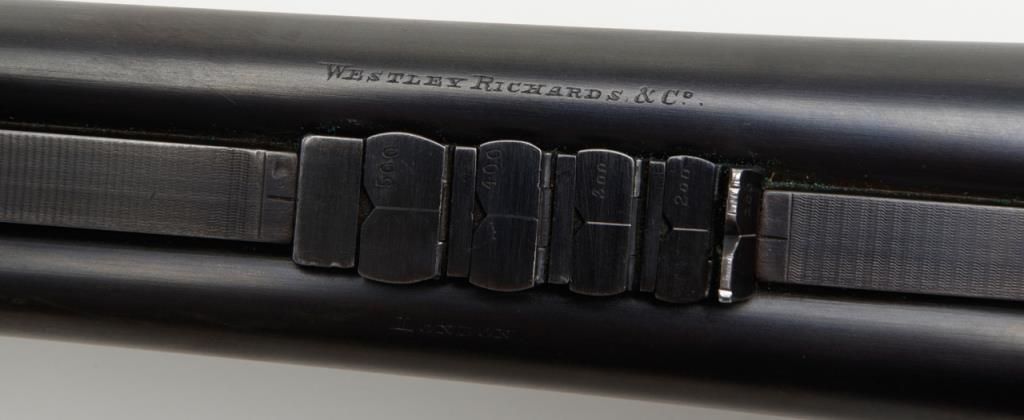 Westley Richards double rifle with Anson- Deeley box lock action in .450-400 Express caliber for 3” shell serial number 08812 on the tang and barrels. The rifle remains in original good to very good condition showing 80% to 90% originalblue on the barrel evenly thinning at the edges with just some slight normal aging. The frame shows 50% plus original case hardening drifting to silvery gray. The removable bottom plate and trigger guard show 50% plus original blue withsome losses at the gripping areas. The stock is good with normal wear, some minor scratches and losses with about 50% original finish. An old recoil pad has been added and needs replacement. The stock measures 13 ½” the end of the wood and14 ½” to the end of the butt plate. The rifle is fitted with five leaf folding sights graduated to 500 yards. The rifle is also equipped with automatic ejectors and locks tight with good bores. A contemporary leather case made for thisrifle is included. Westley Richards in shootable calibers are always desirable. The rifle measures 42 ½” overall with 26” barrels and weighs 10.5 pounds. Est.: $12,500-$25,000