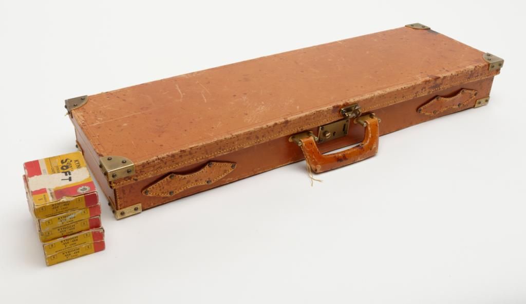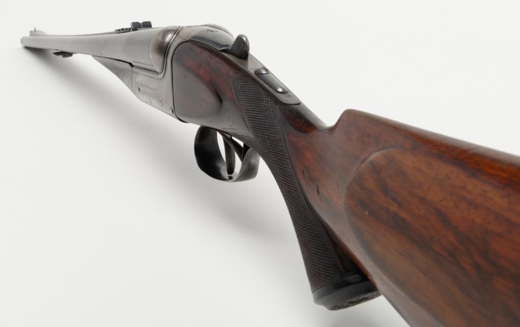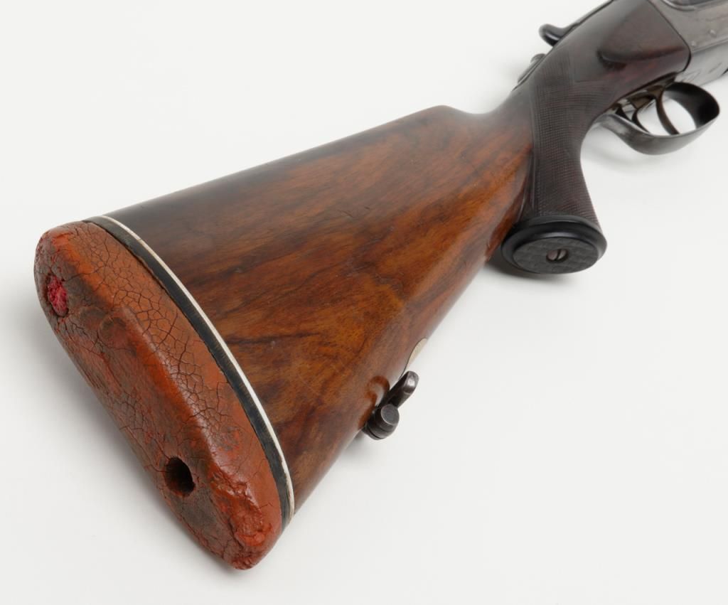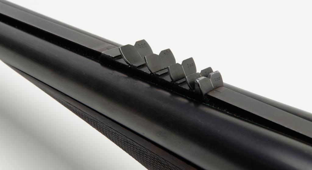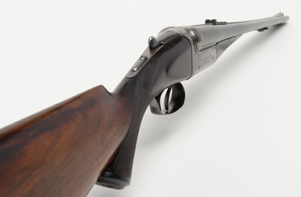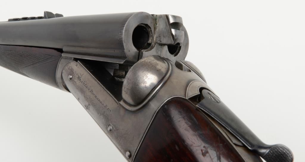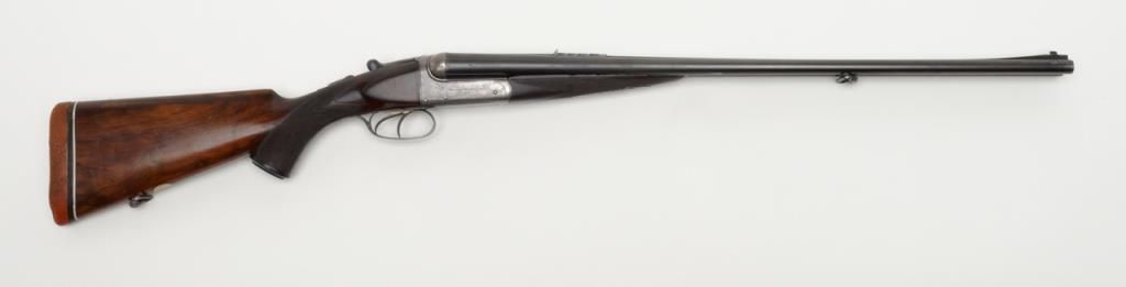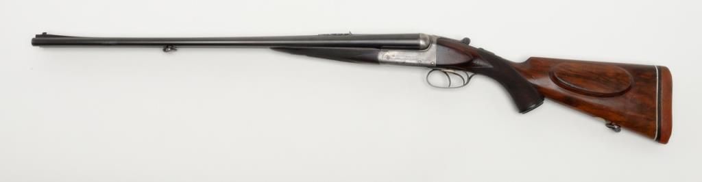 Westley Richards double rifle with Anson- Deeley box lock action in .450-400 Express caliber for 3” shell serial number 08812 on the tang and barrels. The rifle remains in original good to very good condition showing 80% to 90% originalblue on the barrel evenly thinning at the edges with just some slight normal aging. The frame shows 50% plus original case hardening drifting to silvery gray. The removable bottom plate and trigger guard show 50% plus original blue withsome losses at the gripping areas. The stock is good with normal wear, some minor scratches and losses with about 50% original finish. An old recoil pad has been added and needs replacement. The stock measures 13 ½” the end of the wood and14 ½” to the end of the butt plate. The rifle is fitted with five leaf folding sights graduated to 500 yards. The rifle is also equipped with automatic ejectors and locks tight with good bores. A contemporary leather case made for thisrifle is included. Westley Richards in shootable calibers are always desirable. The rifle measures 42 ½” overall with 26” barrels and weighs 10.5 pounds. Est.: $12,500-$25,000