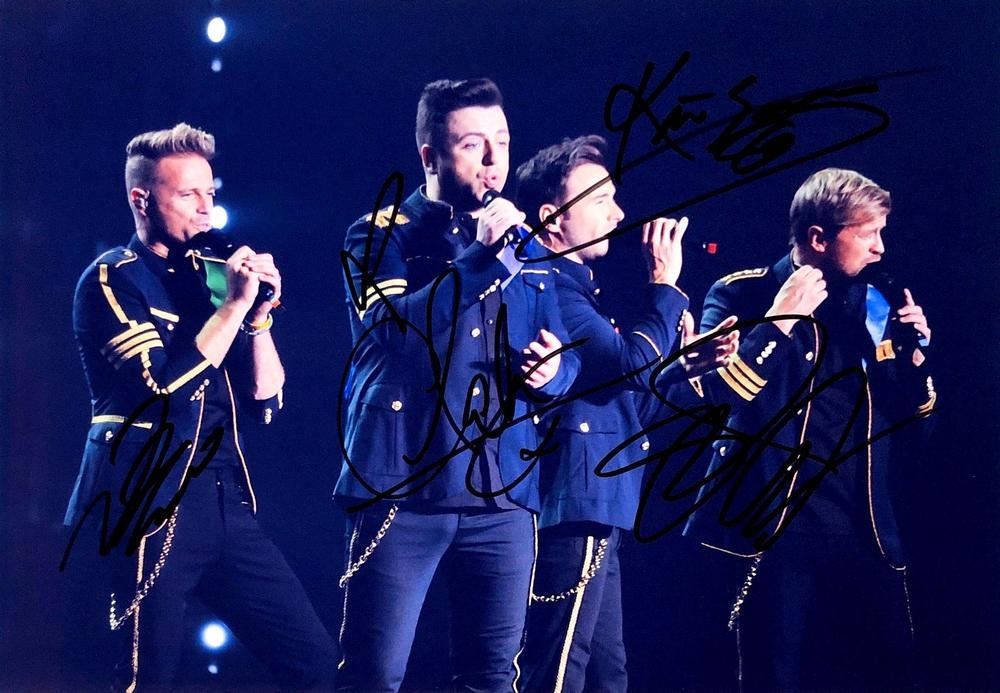 Westlife band facsimile signed photo autographed by Shane Filan, Markus Feehily, Kian Egan and Nicky Byrne. 8x10 inches. This item is a reprint of an original autograph