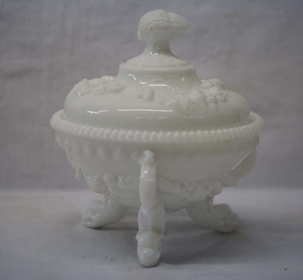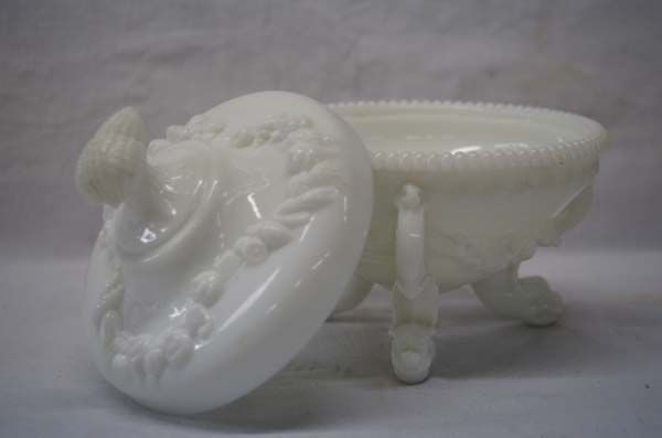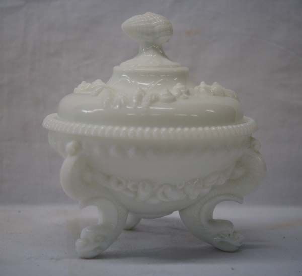 Westmoreland Argonaut Shell 3 Dolphin Candy Dish. Line #1048. White milk glass. It is lidded, intricately decorated, and has a ribbed edge on the dish portion. The bottom section has three dolphin pedestal feet, the sides have raised seashells, and the li