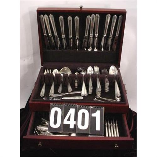 113 Pcs of Westmorland lady hamilton pattern stirling silver in wood case it includes many serving pcs discontinued 1940-2001 in very nice condition 15" x 11" x 6" 15Lb. [81]