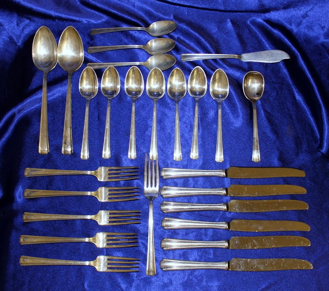 6-Forks-F1-7 1/4 inches long., 10-teaspoons-6 inches long, 6-New French Hollow knife-9 inches long, 1-flat handle master butter knife-7 3/8 inches long, 2-tablespoons (serving spoons)-8 5/8 inches long, & 1-sugar spoon- 5 7/8 inches long. 1,098g