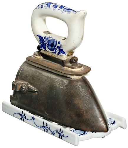 Westphalian Ox-Tongue with Porcelain Trivet, c. 1880 German slug iron, cast iron with "Delft" handle, without slug, length 8 1/4 in. - With porcelain trivet, size 8 2/3 x 4 1/3 in.<Br>
