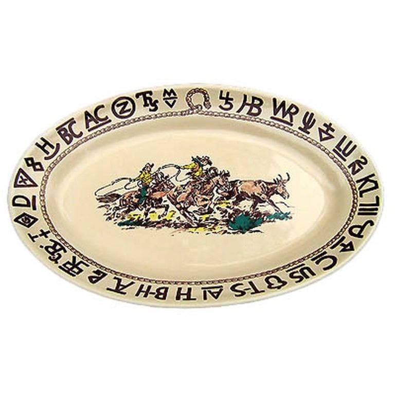 This is a grand large oval serving platter with beautiful Westward Ho Rodeo True West pattern, the very same as seen on the hit television show with Paramount, Yellowstone. The lot contains a single large oval serving platter in the size of 16-inches. The Westward Ho Rodeo pattern dishware or china set by True West follows the exact pattern by Wallace China when produced in 1943-1963 but with contemporary dependable construction. The piece shows the iconic branding iron rope border with amazing Till Goodan artwork at the center having two cowboys on horseback roping some steers. The piece is brand-new unused and Made in the U.S.A.