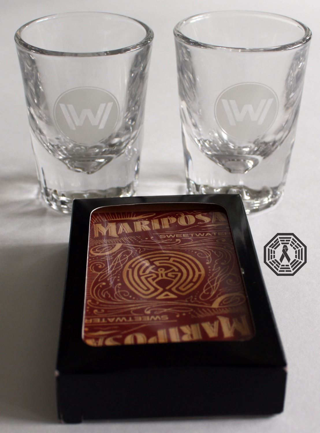 Westworld exclusive cast/crew gift: a set of 2 shot glasses with etched Westworld logo, and a deck of sealed Mariposa Sweetwater playing cards. New. Donated by Kilter Films.