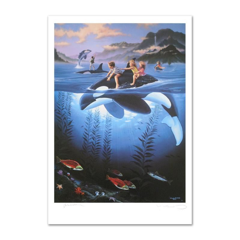 Journey into a world of lifelike imagery and captivating color with this breathtaking collaboration between artists Jim Warren and Wyland! "Whale Rides" is a limited edition lithograph on paper, numbered and hand signed by Wyland and Jim Warren! Includes Certificate of Authenticity! Measures approx. 18" x 26" (with border), 16.5" x 22.5" (image).