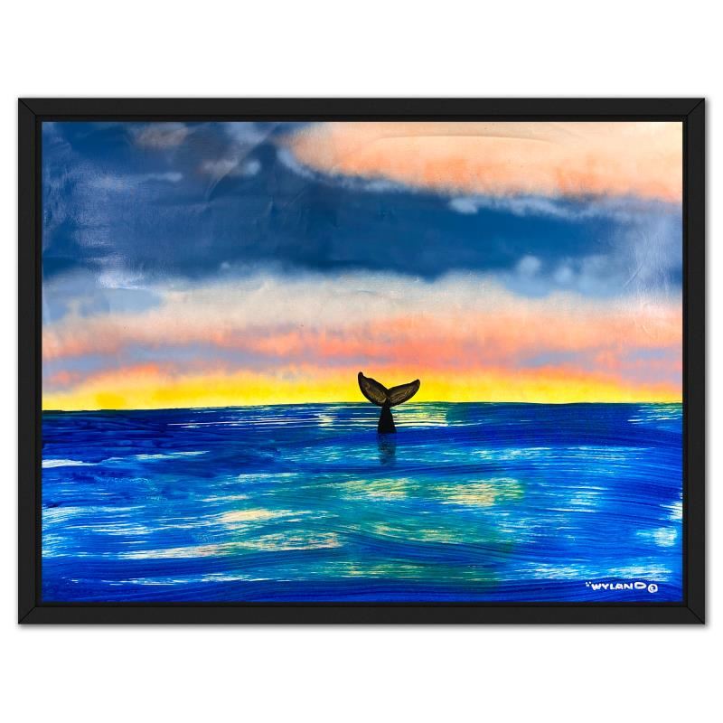"Whale Tail" is an original acrylic painting on canvas by Wyland, hand signed by the artist. This piece comes custom framed. Includes Letter of Authenticity. Measures approx. 42" x 54" (frame), 39" x 51" (image).