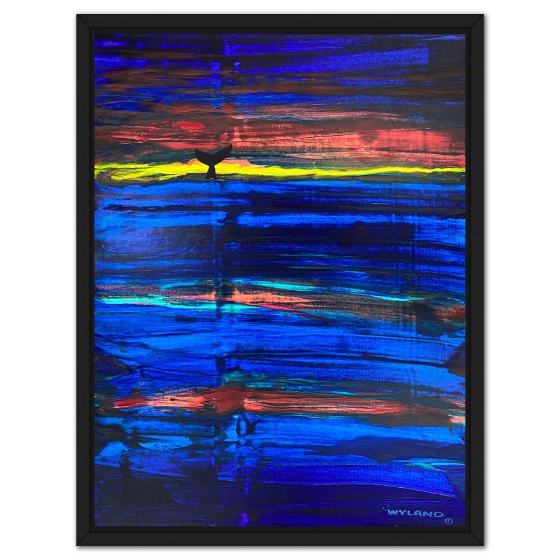 "Whale Tail" is an original acrylic painting on canvas by Wyland, hand signed by the artist. This piece comes custom framed. Includes Letter of Authenticity. Measures approx. 51" x 39" (frame), 48" x 36" (image). This item requires special handling and may have a longer than usual turnaround.