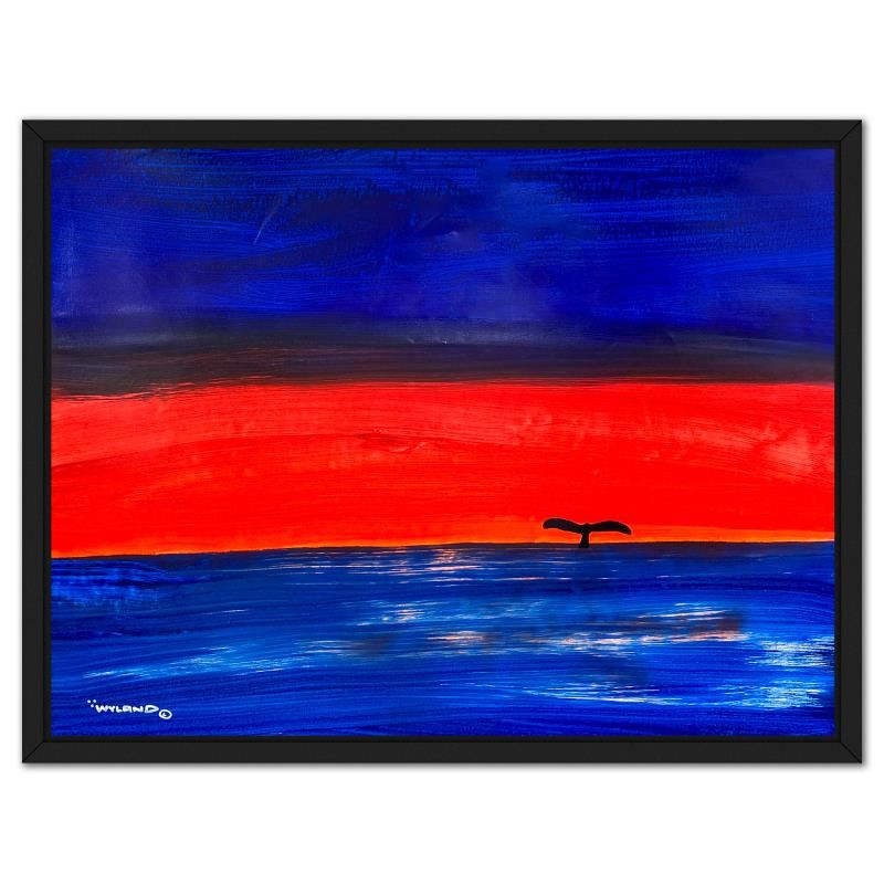 "Whale Tail" is an original acrylic painting on canvas by Wyland, hand signed by the artist. This piece comes custom framed. Includes Letter of Authenticity. Measures approx. 42" x 54" (frame), 39" x 51" (image). This item requires special handling and may have a longer than usual turnaround.
