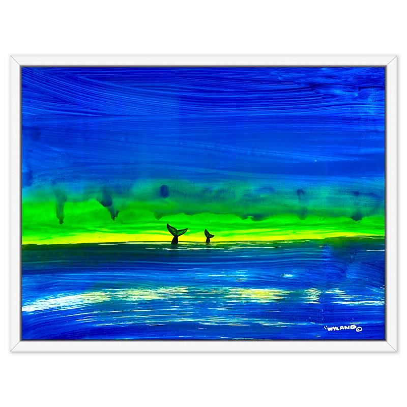 "Whale Tails"is an original acrylic painting on canvas by Wyland, hand signed by the artist. This piece comes custom framed. Includes Letter of Authenticity. Measures approx. 36" x 46" (frame), 33" x 43" (image). This item requires special handling and may have a longer than usual turnaround.