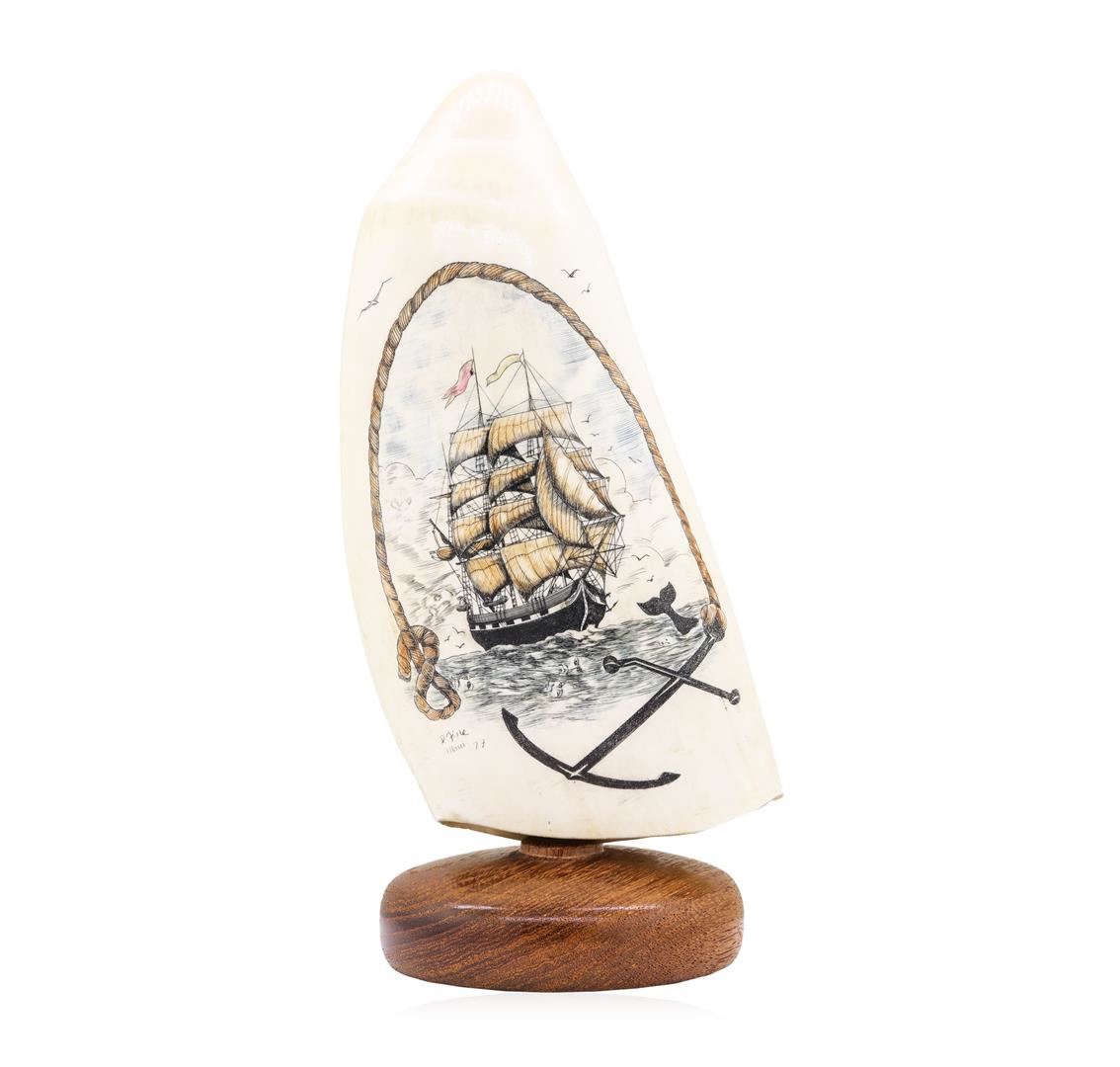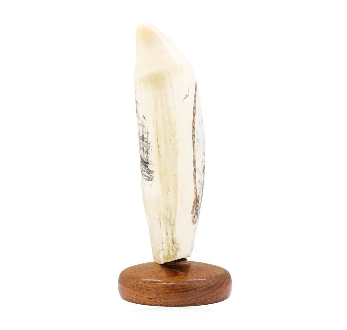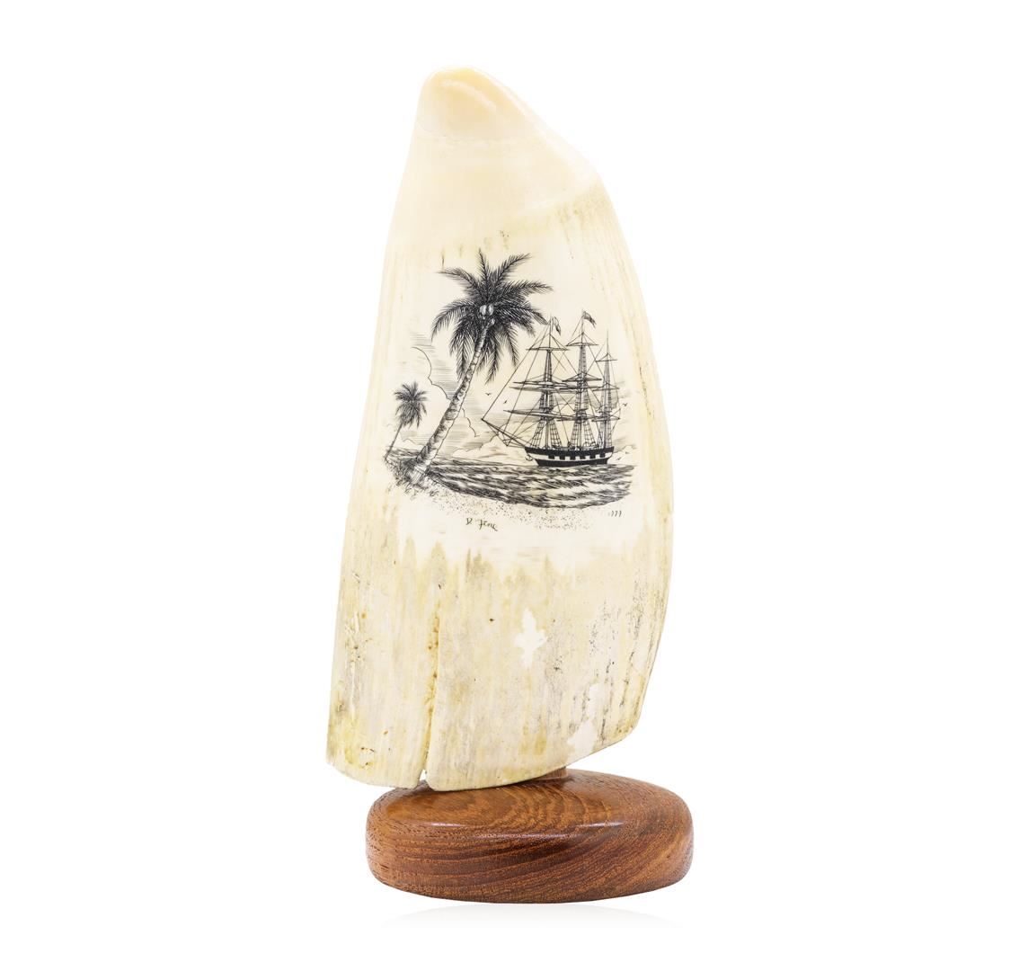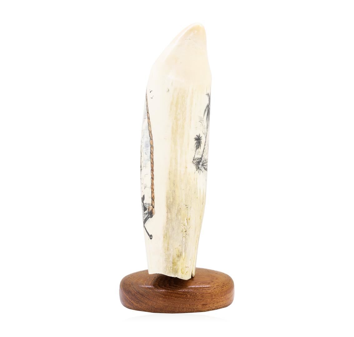 Beautiful Color Scrimshaw Whale Tooth by Famous Maui Artist Doug Fine, signed original. Measures approximately 7 inches across and 3 inches tall.