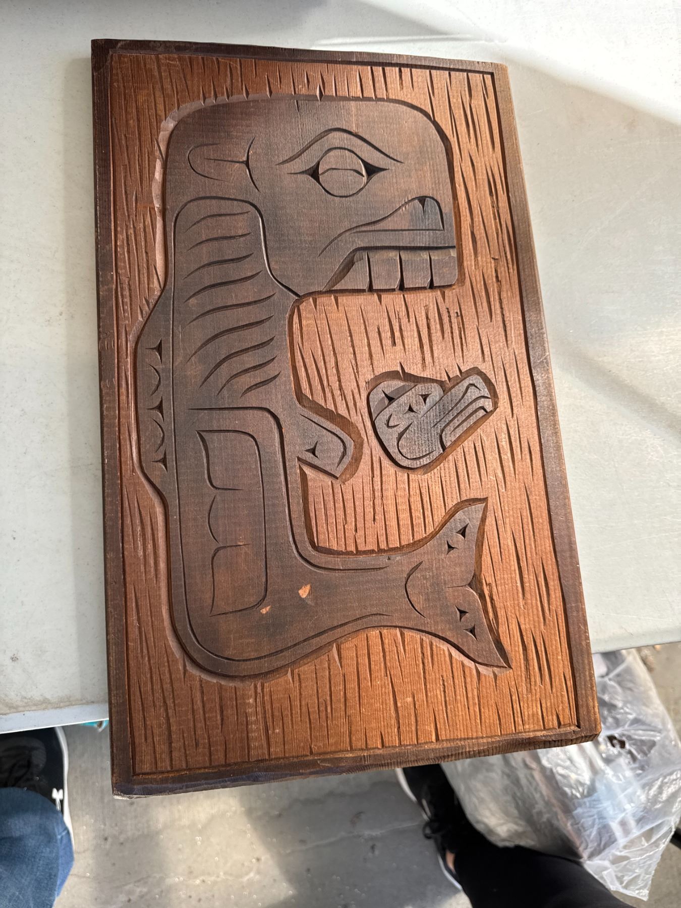 Whale and raven cedar panel signed Wanik 74, 11" x 18"