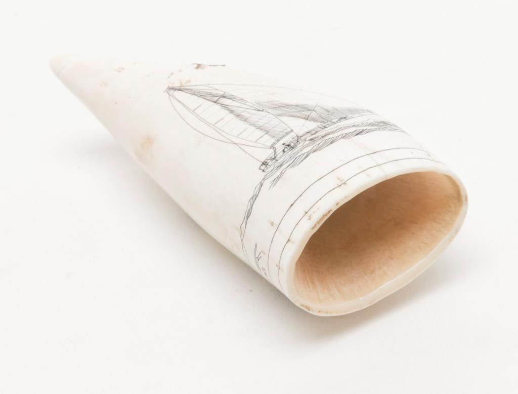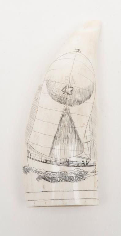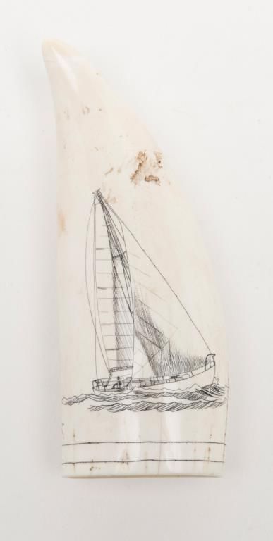 Whale’s tooth approx. approx. 4-1/2” X 2” X 1-1/4”, nicely scrimshawed on both sides with sailboats. (NO SALE TO CALIFORNIA RESIDENTS). Est.: $200-$300.