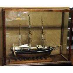 Cased model with wonderful detail of an early whaling ship called the Wanderer. We have quite a bit of printed information on this model which will go with it. The overall size of the case is 32 inches wide and 26 inches high, 12 inches deep.