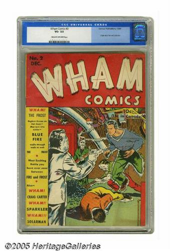 <B>Wham Comics #2 (Centaur, 1940) CGC VG- 3.5 Cream to off-white pages.</B></I> Origins of Blue Fire and Solarman. Overstreet 2005 VG 4.0 value = $216. CGC census 2/05: 1 in 3.5, 1 higher.