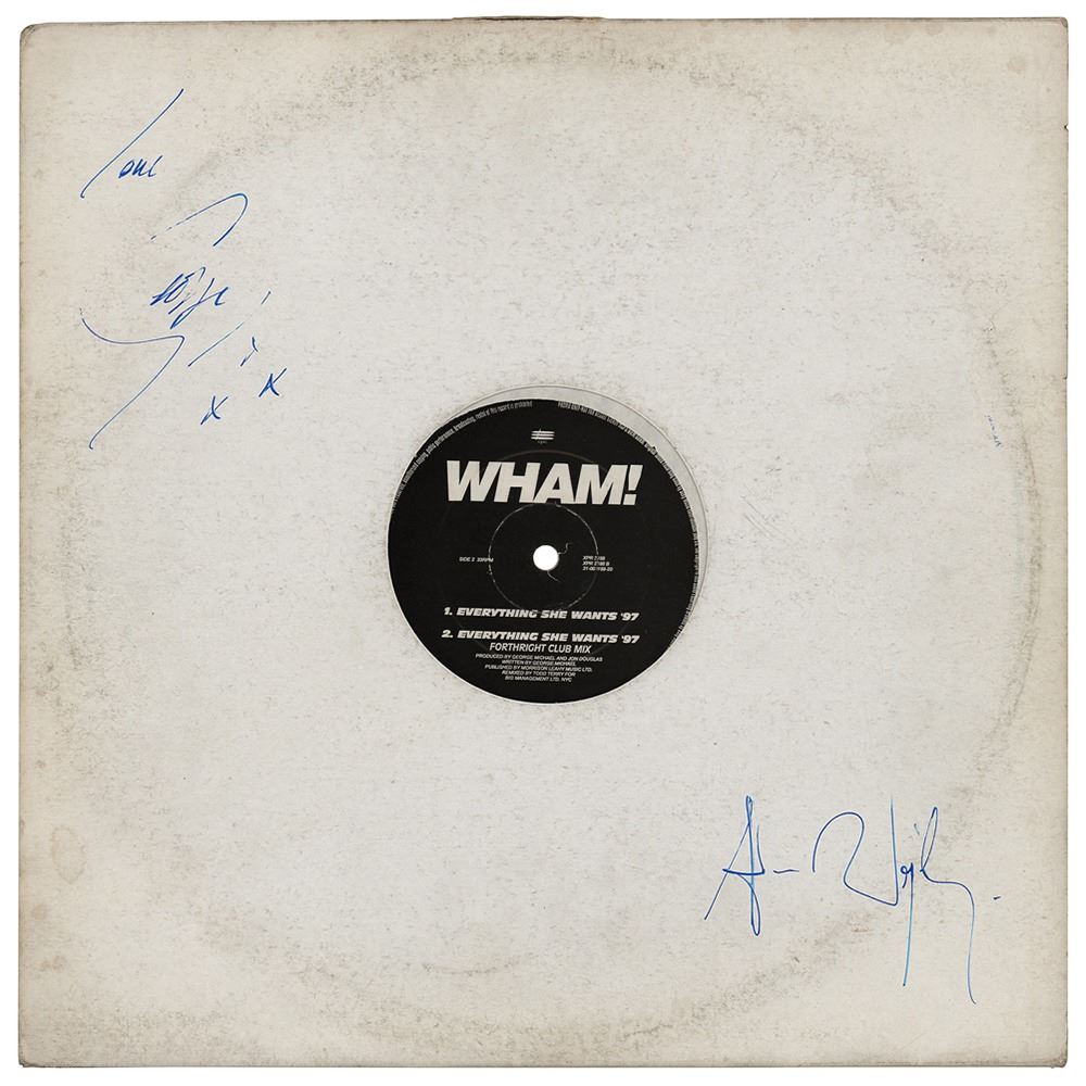 'Everything She Wants '97' 12-inch single album by Wham!, signed on the plain white album cover in blue ink, "Love, George, xxx" and "Andrew Ridgeley." In very good to fine condition, with light scuffing and soiling. The record is included.