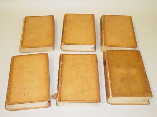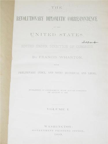 Wharton, Francis [edited Under Direction of Congress by]. The Revolutionary Diplomatic Correspondence of the United States - 6 Volumes. Washington: Government Printing Office, 1889. 8vo - over 7¾" - 9¾" tall. Hard Cover. Ex-Library. Poor condition. Complete in 6 volumes. Leather bound with blind stamped borders, raised bands on spine, red & black leather spine labels. Covers loose or detached, one backstrip lacking, other chipping, vol. 5 lacks back cover. BINDINGS TIGHT, except in vol. 1, which has a loose signature.