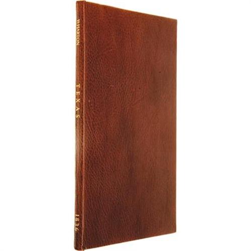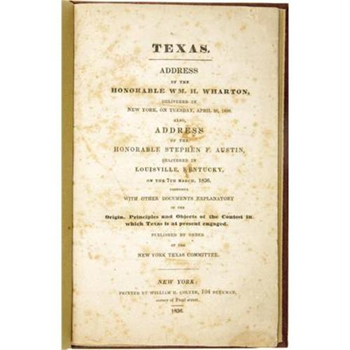 <B>[William H. Wharton] [Stephen F. Austin]</B></I> <B><I>Address of the Honorable Wm. H. Wharton, delivered in New York ... Also, Address of the Honorable Stephen F. Austin, delivered in Louisville, Kentucky, on the 7th March, 1836 ... Together with other documents... </B></I></B></I> [New York: Printed by William H. Colyer, 104 Beckman, corner of Pearl Street. 1836.] 56 pp. Crown Octavo. This important pamphlet was instrumental in bringing detailed information about the Texas Revolution to the United States. It publishes the speech that Wharton, one of the commissioners of the Republic of Texas to the United States, gave in New York on April 26, 1836, urging the justice of the cause. In addition, it republishes Austin's similar address, given in Louisville on March 7 of that year, in which Austin stated that Texas declined taking up arms against Mexico until "further submission on our part would have been both ruinous and degrading," and that the object of Texas was "freedom" to be obtained by becoming "a new republic or by becoming a State of the United States." <BR><BR>Appended is the first printing in book or pamphlet form of the Texas Declaration of Independence, passed at Washington, Texas, on March 2, 1836. This pamphlet was probably issued immediately after the April 26 meeting where Wharton spoke. Contemporary brown full leather with gilt lettering on spine. Moderate foxing on initial and terminal pages, occasional foxing otherwise. In fine condition. <I>From the collection of Darrel Brown.</B></I><BR><BR><B>Reference: </B></I>Streeter 1260.<BR><BR><b>Shipping:</b> Books & Catalogs (<a target="_blank" href="http://www.heritageauctions.com/common/shipping.php">view shipping information</a>)