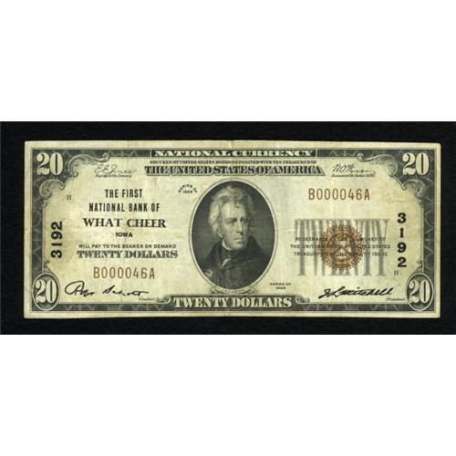 <B>What Cheer, IA</B></I> - $20 1929 Ty. 1 <B>The First NB</B></I> Ch. # 3192<BR> Type Ones only in small size from this small bank that fell to the receiver in early 1934. This was the only bank in this popularly named town and just a handful of examples are left for today's collectors. No problems are detected on this evenly circulated <B>Very Fine </B></I>$20. <BR><BR><b>Shipping:</b> Coins & Currency (<a target="_blank" href="http://www.heritageauctions.com/common/shipping.php">view shipping information</a>)
