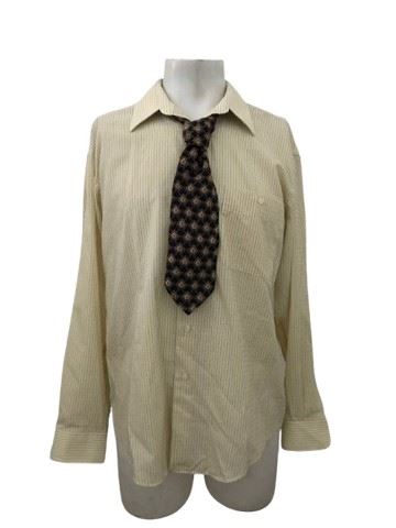 What Dreams May Come (1998) - Chris (Robin Williams) screen worn Yves Saint Laurent (16 and 1/2, 34–35 – L) pale yellow with fine white and navy stripes dress shirt, and a navy with brown design navy with amber diamond Kenneth Cole tie.