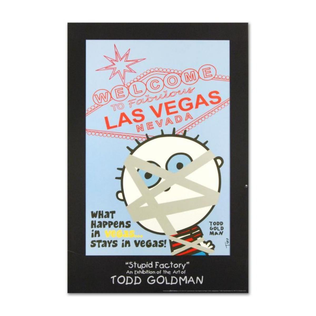 ADD THE IRREVERENT ARTWORK OF WORLD-RENOWNED ARTIST TODD GOLDMAN TO YOUR COLLECTION! Pop artist Todd Goldman is known all across the globe for his whip-smart and wickedly funny puns and pictures! "What Happens in Vegas..." is a fine art litho poster hand signed by Todd. Measures approx. 24" x 36" (poster).