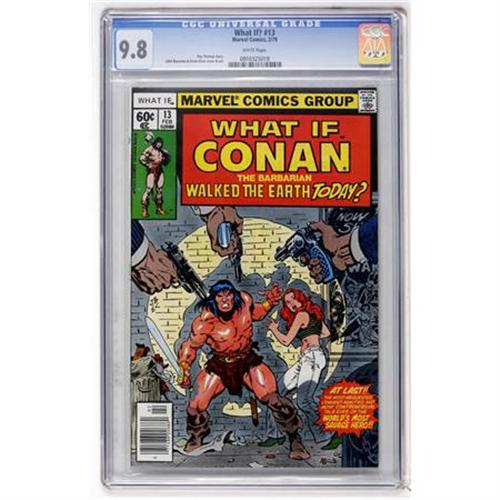 <B>What If? #13 Conan (Marvel, 1979) CGC NM/MT 9.8 White pages.</B></I> What if Conan the Barbarian walked the Earth today? John Buscema cover and art. Overstreet 2007 NM- 9.2 value = $3. CGC census 3/08: 6 in 9.8, none higher.<BR><BR><b>Shipping:</b> Comics - Slabbed (certified) (<a target="_blank" href="http://www.heritageauctions.com/common/shipping.php">view shipping information</a>)