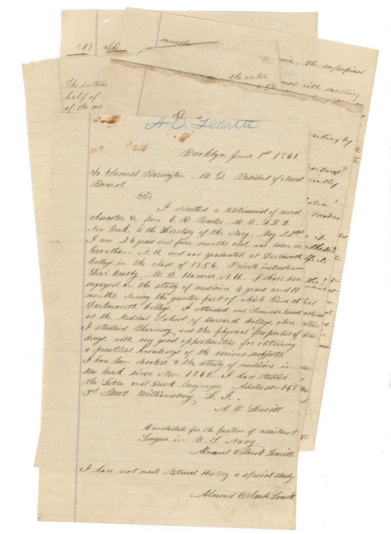Almond Orlando Leavitt Application submitted to Samuel Barrington, M.D., President of the Naval Examining Board, for a position as an Assistant Surgeon. 5 pages. June 1, 1861. Leavitt provides detailed answers to 8 questions including subjects such as “various methods for treating fractures” and “What is Chloroform and how does it differ in its effects from other anesthetics?” Leavitt enlisted on July 30, 1861 and served on USS POTOMAC. He retired on June 24, 1862. Nice medical content.