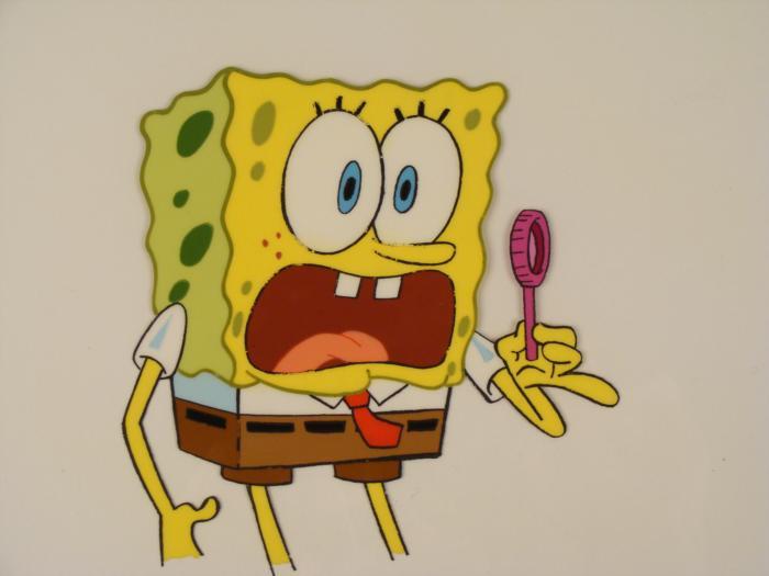 This original animation cel is from the Nickelodeon TV show SpongeBob Squarepants. The story takes place under the deep blue sea in Bikini Bottom, where SpongeBob resides. SpongeBob, who is a yellow, porous sponge, is your typical happy-go-lucky character, as he is always cheerful and enjoys making people laugh. Patrick Star, SpongeBob's neighbor who is a starfish, is your average children's show idiot, as he boasts knowing nothing and is often getting himself into ridiculous situations. Between the homes of these two lies the home of the miserable Squidward, a squid, who is known for being grouchy and playing tricks on SpongeBob and Patrick. Both SpongeBob and Squidward work at the Krusty Krab, a fast food business run by the greedy money-loving Mr. Krabs, a crab, the arch rival of the evil, possibly misunderstood, Plankton. Another neighbor, Sandy Cheeks, an athletic squirrel who normally wears an astronaut's space suit, was introduced in "Tea at the Treedome." She spends most of her time inventing and experimenting. Show here, it looks like Spongebob might lose it. He can't fathom why there are no bubbles forming. Original Production Animated Cel Overall Size of Cel: 10 1/2" x 12 1/2" Excellent ConditionThis is an original hand-painted cel set-up used in the production of an episode of "SpongeBob SquarePants." Each one-of-a-kind set-up represents a slight change in position of the characters. When individually photographed and projected in rapid succession, the images appear to move.