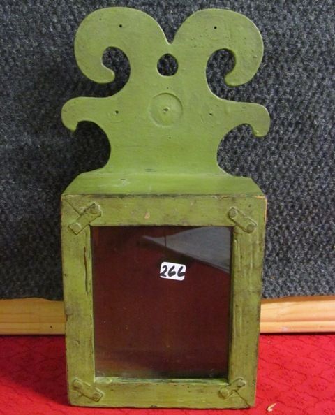 19th Century Glass front Wall Hanging "What Not" Box in original green paint, design crest 13" t x 6" w x 4"