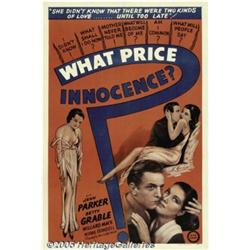 <B>What Price Innocence? (Columbia, 1933)</B></I> One Sheet (27" X 41"). Jean Parker and Betty Grable star in this cautionary drama about a young woman who pays the price for messing around with men. The tag line reads, "She didn't know there were two kinds of love........until it was too late. The pre-Hayes Code illustrations on this poster feature a scantly clad woman who is nearly topless. There is fold line wear with a touch of paper loss at the crossfolds and borders, and a few light scratches. The poster has been professionally restored, minimizing these defects. Fine/Very Fine on Linen.