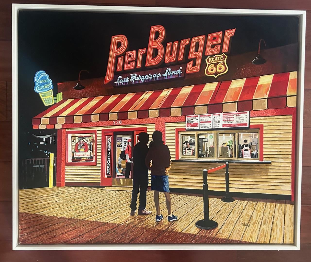 An original acrylic on 26.75"x32.75" stretched canvas by Roger Bigg, depicts the famed Santa Monica café called PierBurger. 28.25x34.5" floaterframe, with artist's COA.