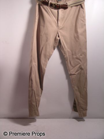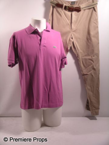 A screen worn, hero Gary (Ben Falcone) wardrobe from the 2012 romantic-comedy 'What to Expect When You're Expecting.' Costume contains a short sleeve, dark lavender polo shirt with 'Lacoste' label (size 5), a beige canvas belt, and pair of khaki pants with 'J. Crew' label. (size 34 x 30)