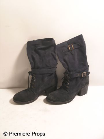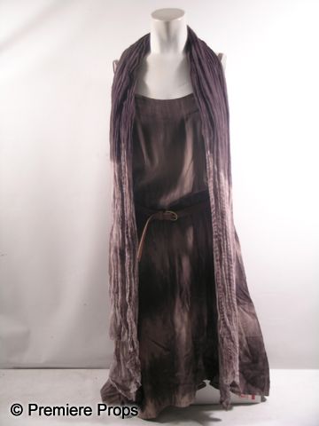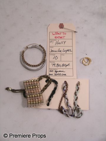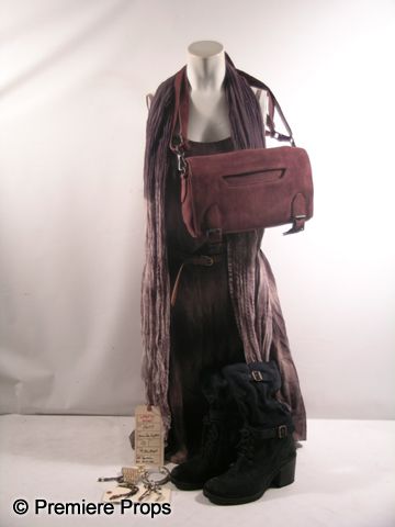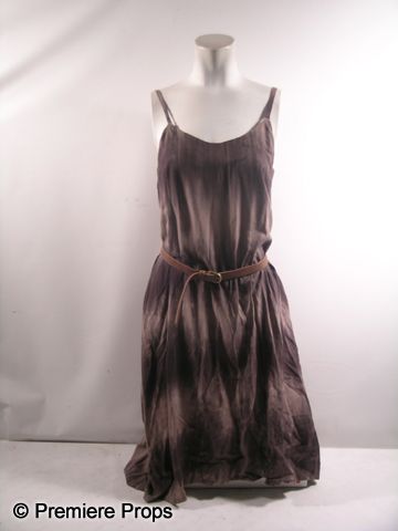 From the 2012 romantic-comedy 'What to Expect When You're Expecting,' this is Holly's (Jennifer Lopez) screen worn, complete hero costume. The wardrobe consists of a dirty brown & grey colored tie-dye dress with 'Brooch Walker' label (size S), a thin, brown belt with 'Brooch Walker' label, a smoky, black tie-dye scarf, a small size reddish-purple suede messenger bag with 'Theory' label, multiple bracelets, one faux gold ring, and a pair of black suede lace up boots with 'Jill Sander' label. (size 38.5) Includes studio wardrobe tag.
