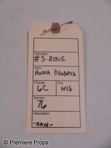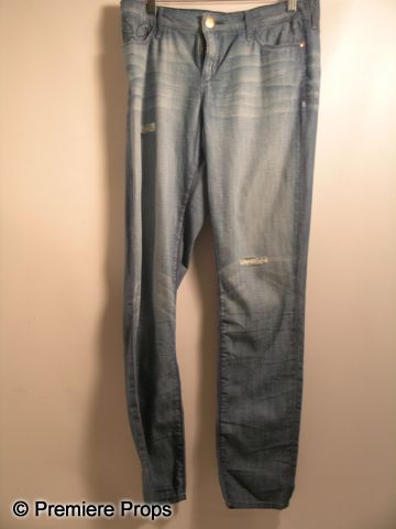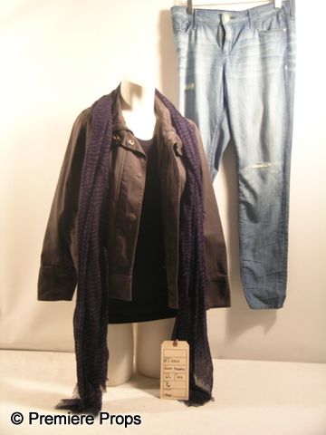 From the 2012 romantic-comedy 'What to Expect When You're Expecting,' this is Rosie's (Anna Kendrick) screen worn, hero costume. Wardrobe contains a dark, military style green 'J. Crew' jacket (size XS), a black , short sleeve t-shirt with 'The Summer Shirt' label (size S), an indigo colored scarf with black frayed edges, and a pair of light blue denim jeans with 'Habitual' label. (size 25) Includes wardrobe tag.