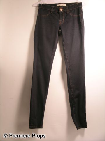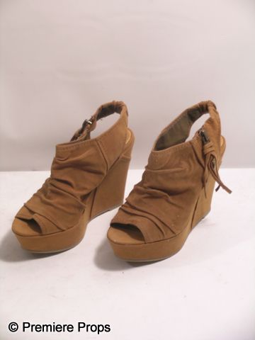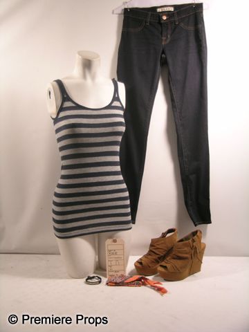 A complete, screen worn hero costume worn by Anna Kendrick for her role as Rosie in the 2012 Kirk Jones film 'What to Expect When You're Expecting.' The costume consists of a navy blue and grey tank top with 'Vince' label (size S), a pair of dark blue jeans with 'J. Brand' label, a thin black leather bracelet, an orange paisley bandanna, and a pair of brown suede wedge heels with 'Big Buddha' labels. (size 7) Includes studio wardrobe tag.