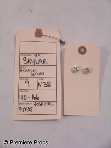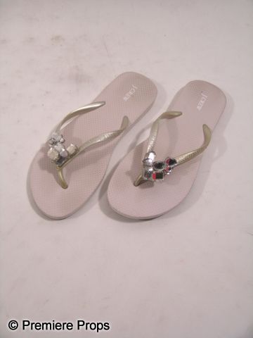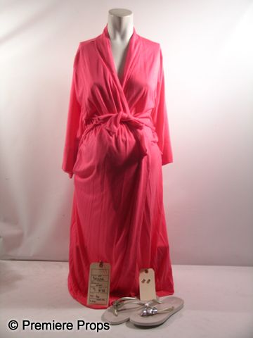 A screen worn, hero Skyler (Brooklyn Decker) wardrobe from the 2012 romantic-comedy 'What to Expect When You're Expecting.' The wardrobe consists of a hot pink robe with waist belt and 'Natori' label (size S), a nine-month pregnancy prosthetic belly appliance, a pair of large faux diamond earrings, and pair of silver rubber sandals with large fake crystals and 'J. Crew' label. (size 8) Includes wardrobe tag.