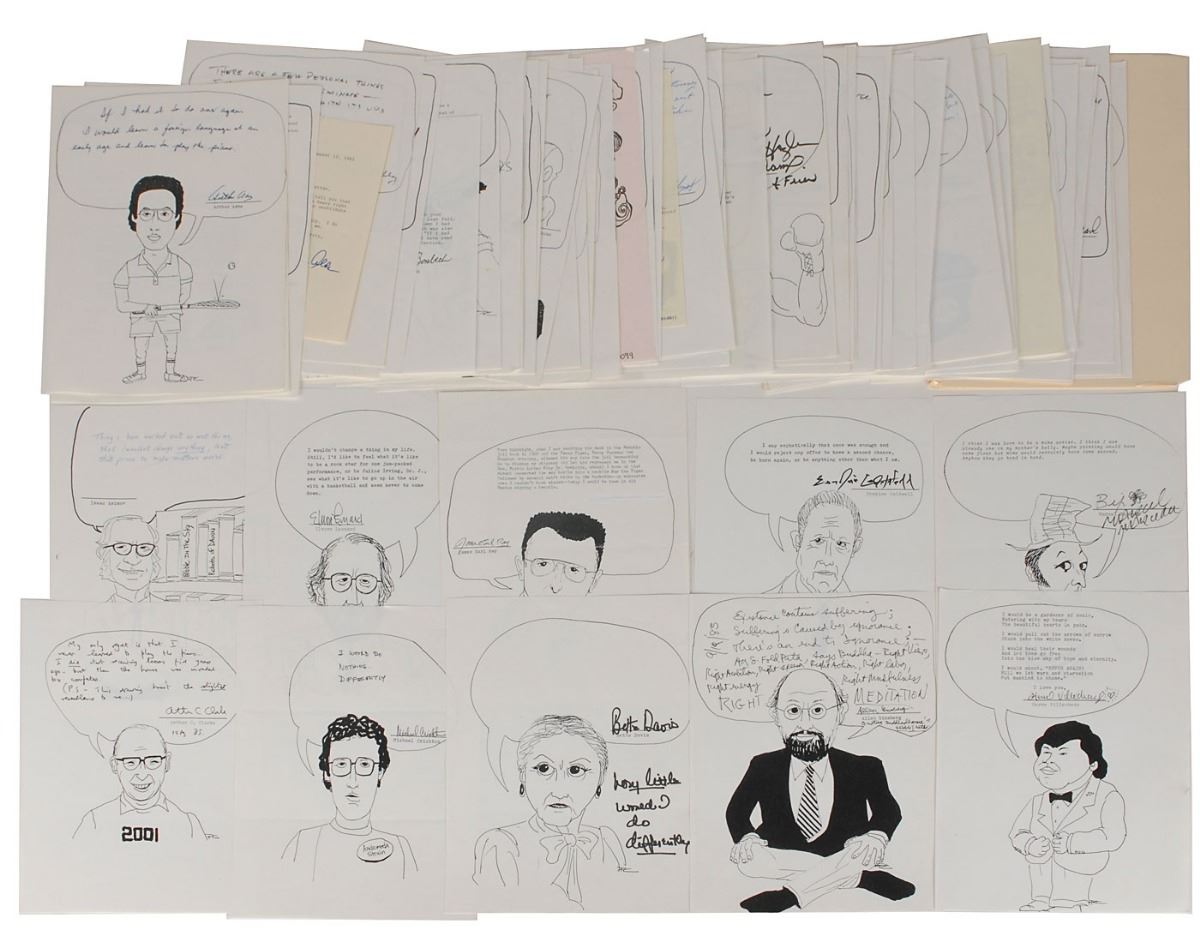 Unusual collection of over 60 custom-printed cartoons and letters filled out by celebrities and notable figures from a wide variety of fields, all responding on the subject of ‘If I had to do it again…’ Represented within the collection are noteworthy writers, athletes, politicians, religious figures, and more. This collection was compiled by Paul Rifkin, who edited a compilation of letters responding to the question, ‘Do you believe in God?,’ entitled The God Letters, published by Warner Books in 1986. In overall fine condition. Due to the large quantity a few other secretarial and/or printed signatures may be included. Interested parties are encouraged to view the collection in person at our offices or call us with specific inquiries, as this collection is sold as is and no returns will be accepted. A complete collection of images is available online.