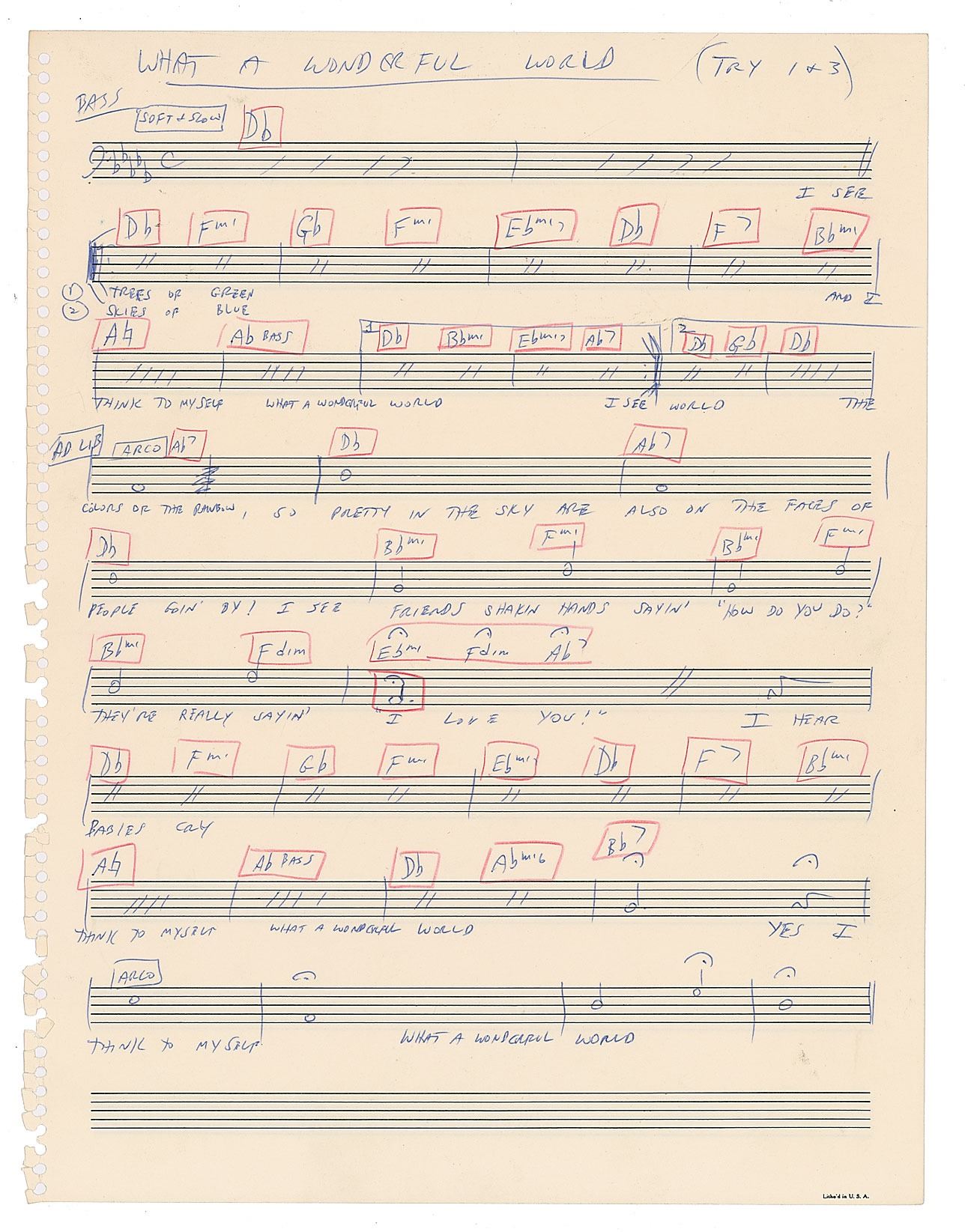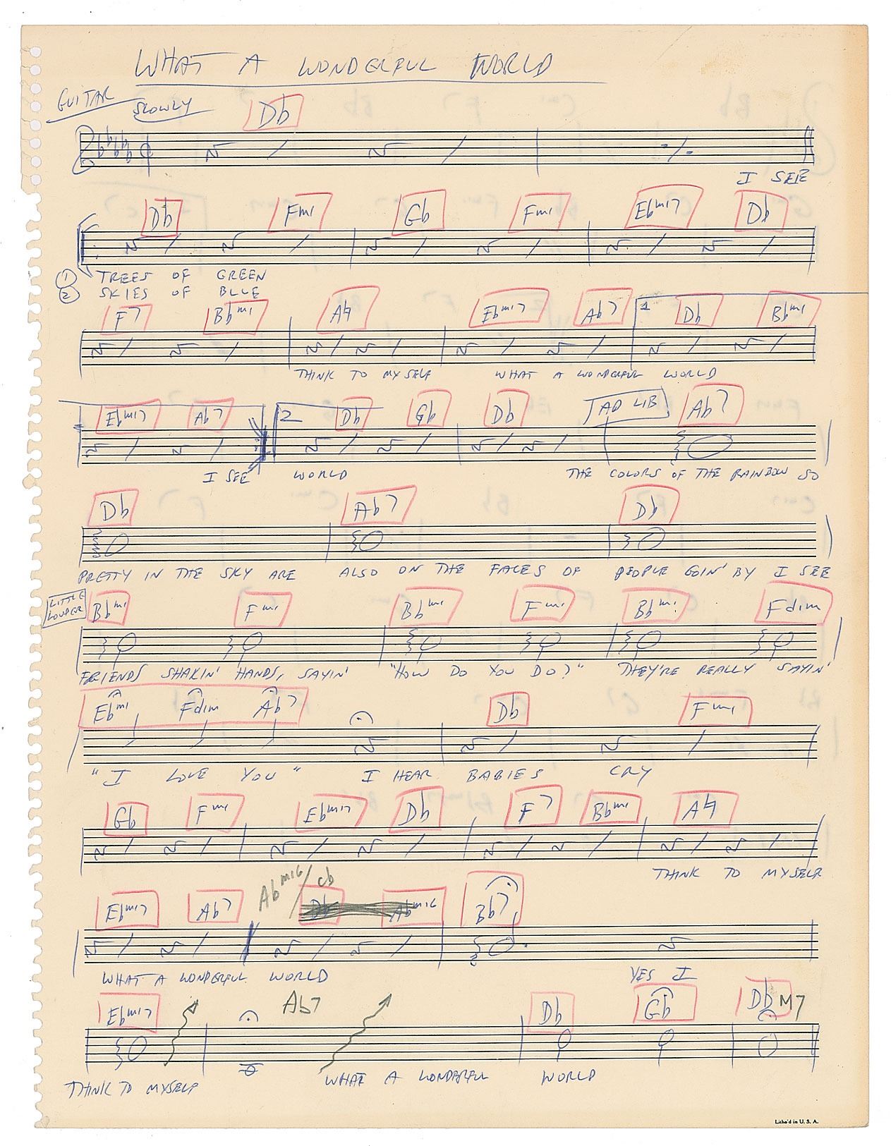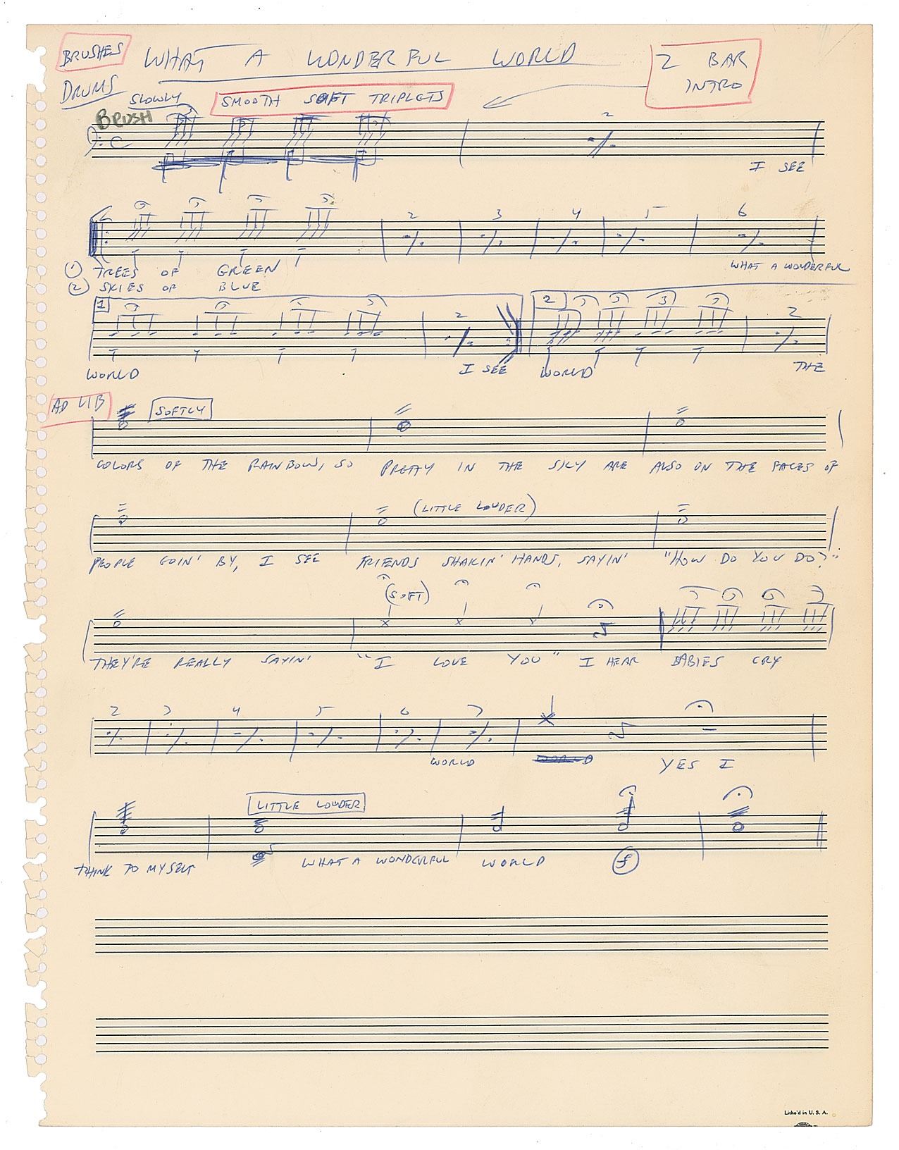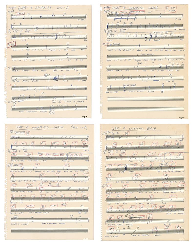 Important handwritten musical manuscript by George David Weiss for the iconic Louis Armstrong song, four pages, 9.25 x 12, each page headed with the title, "What a Wonderful World," and instrument: "Brushes/Drums," "Trumpet or Tenor," "Bass," and "Guitar." The back of the "Guitar" page has a handwritten chord change chart. On each page, Weiss pens the music for the associated instrument, as well as the song's memorable lyrics, in part: "I see friends shakin' hands, sayin' 'How do you do?' / They're really sayin' 'I love you' / I hear babies cry…think to myself what a wonderful world / Yes I think to myself / What a wonderful world." In fine condition.